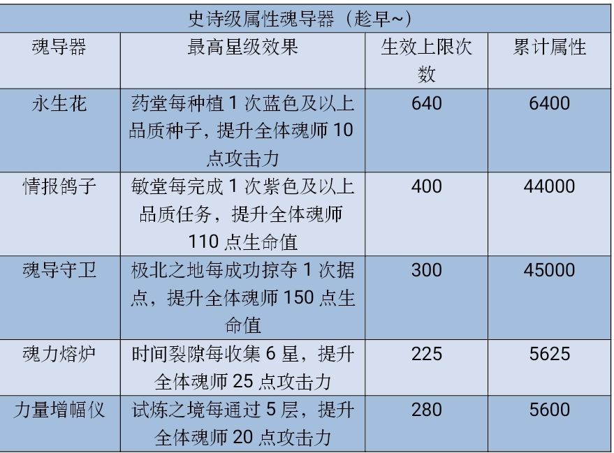 永生花/情报鸽子<魂力熔炉/力量增幅(前期爬塔和时空裂隙在短时间内就可以完成多个任务,而种草和掠夺需要一点一点的积累)魂导守卫位的培养放到最后,进度过慢。
