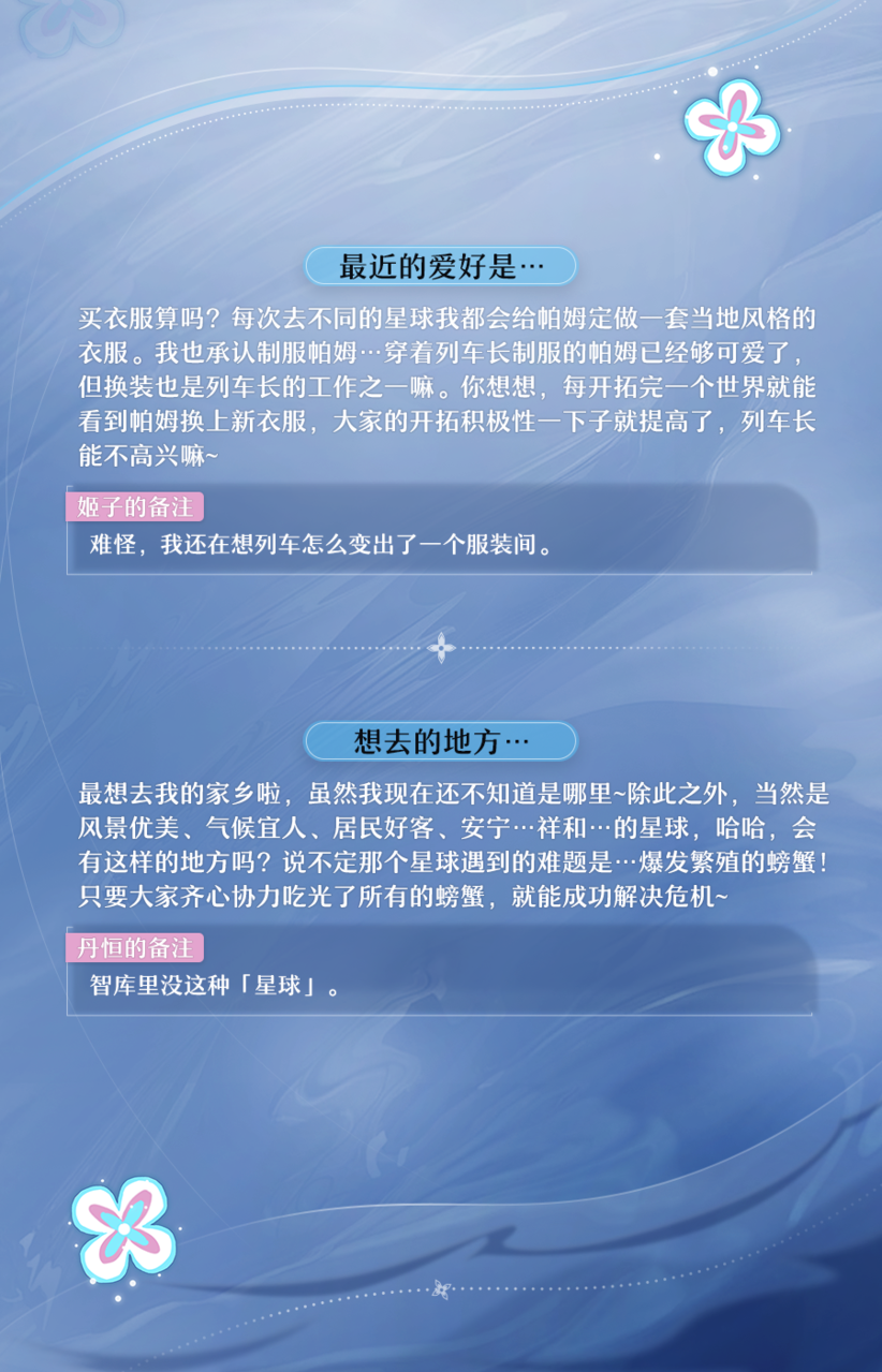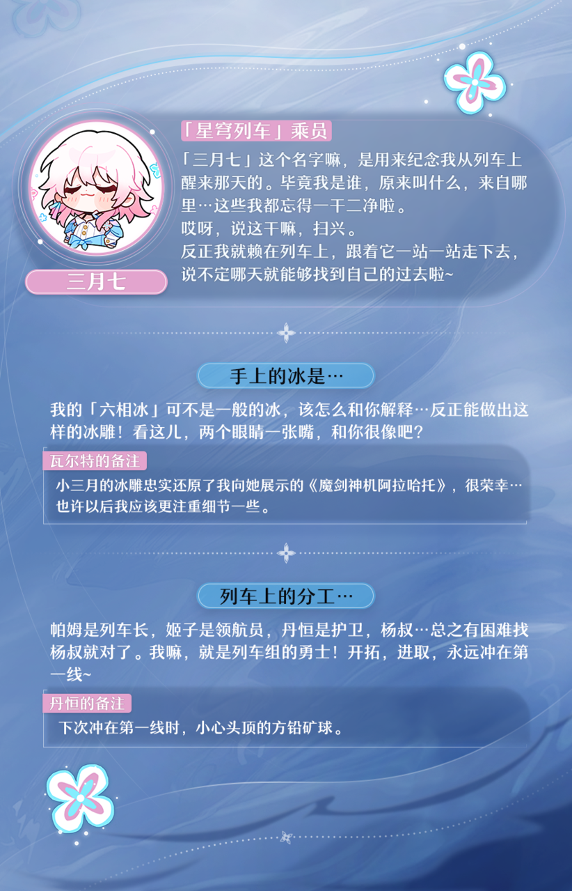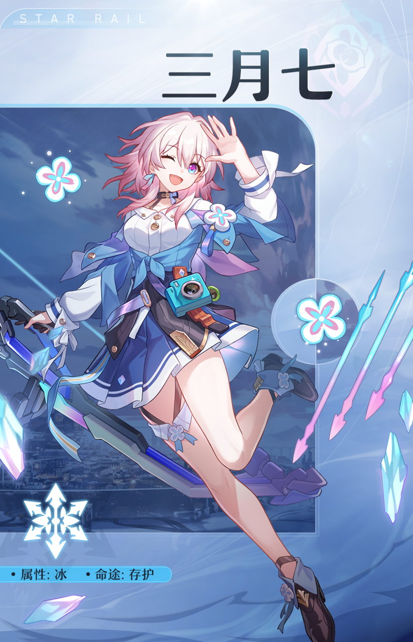 「角色介绍 | 三月七」小光高能速递发布于 2022-04-22关注 「三月七」这个名字嘛,是用来纪念我从列车上醒来那天的。 毕竟我是谁,原来叫什么,来自哪里…这些我都忘得一干二净啦。 哎呀,说这干嘛,扫兴。 反正我就赖在列车上,跟着它一站一站走下去,说不定哪天就能够找到自己的过去啦~ 三月七角色PV——「来,拍照啦!」 01:53