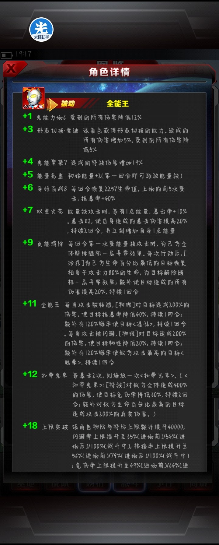 +9被动负能消除每回合第一次受能量技攻击时,为己方全体解除随机一层异常效果。每次行动后,[治疗]为己方生命百分比最低的目标恢复相当于攻击力80%的生命,为目标解除随机一层异常效果;额外使目标造成的所有伤害提高20%,持续|回合,增益效果加成