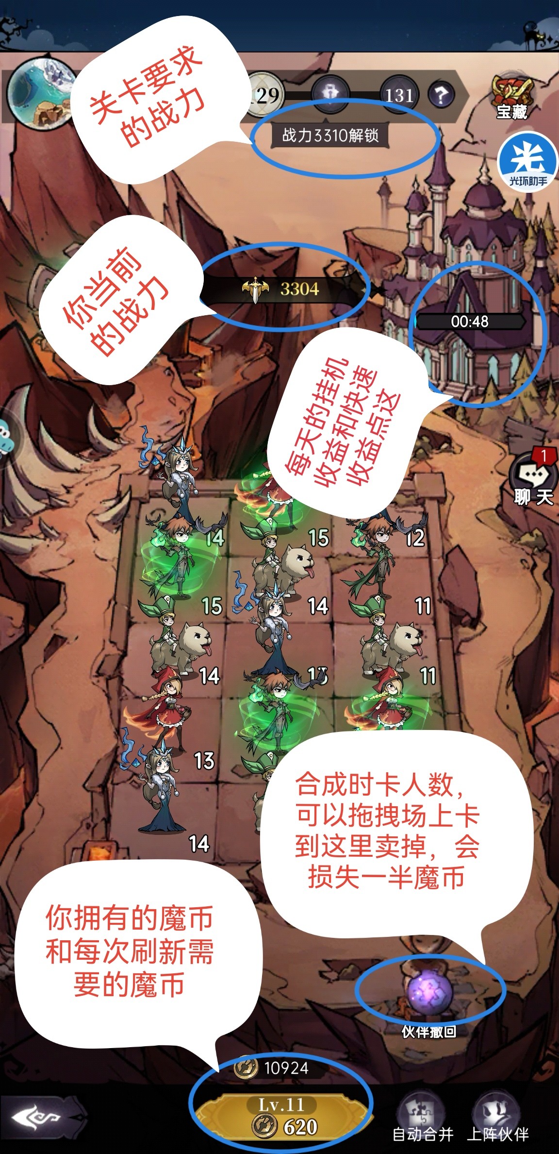 1.前期用最初阶段的菲丽公主、莉丝欧皇、拇指男孩打工就行。场上一共15个位置,三者大概平均分配就行。