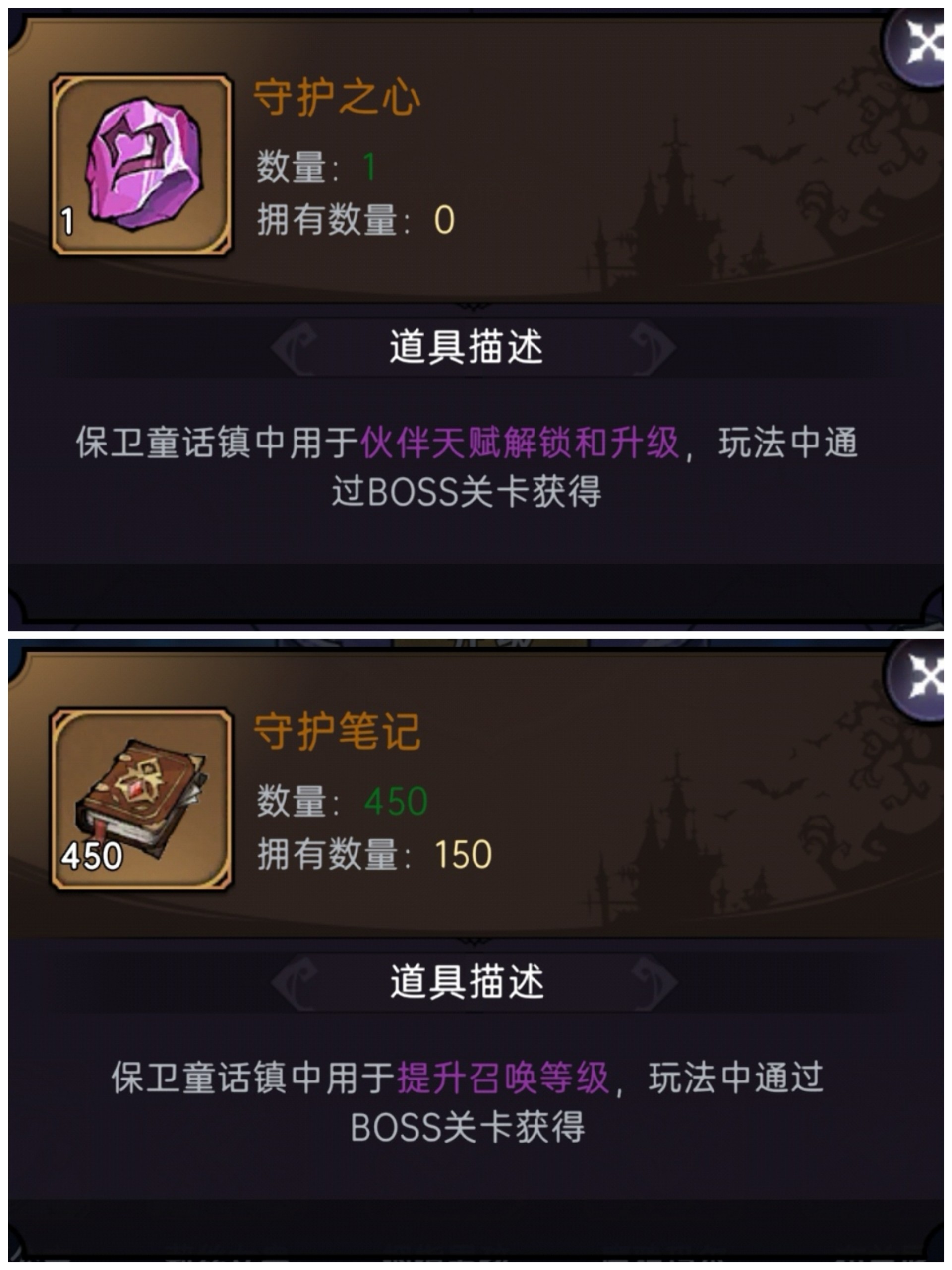 1.每5关会有一个boss,击杀boss会掉落守护之心和守护笔记,关卡等级高以后还会随机掉落各种核心。守护之心用于升级天赋技能,守护笔记用于提升召唤等级。