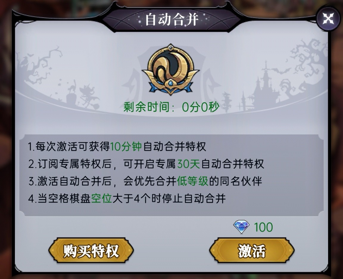 3.面板上的“自动合并”不购买特权也可以用钻石开启,不过没什么太大用处,升级场上伙伴还是大家手动操作比较好。