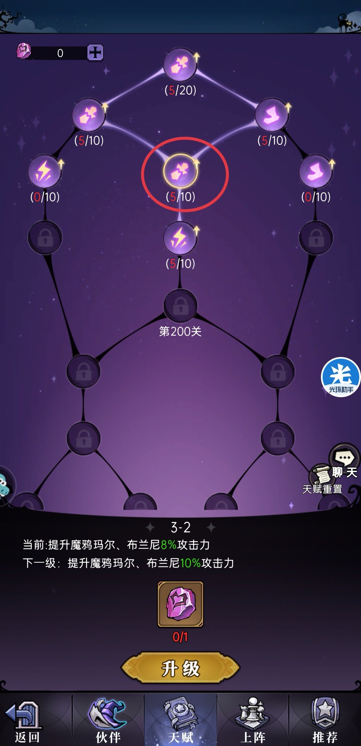2.前期天赋要优先点出图片上红圈标注的天赋,解锁魔鸦和布兰妮。魔鸦攻击速度快且能攻击两个单位,布兰妮可以灼烧敌方单位,前期都特别好用。