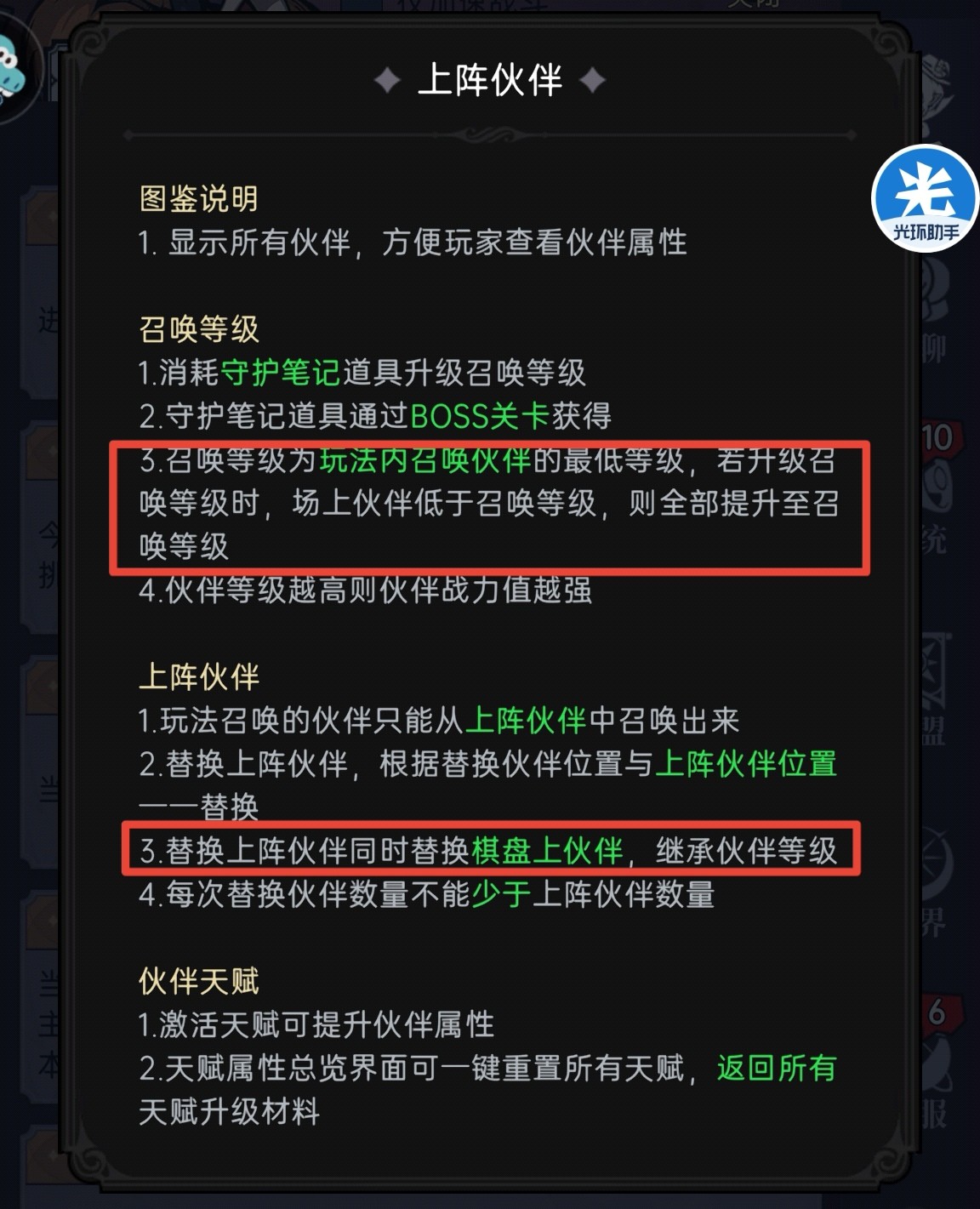 当你提升召唤等级的时候,你场上所有低于召唤等级的伙伴都会免费提升到召唤等级。举个例子,你场上有不少10级伙伴,这个时候你把召唤等级升到11级,这些10级伙伴会自动升到11级。