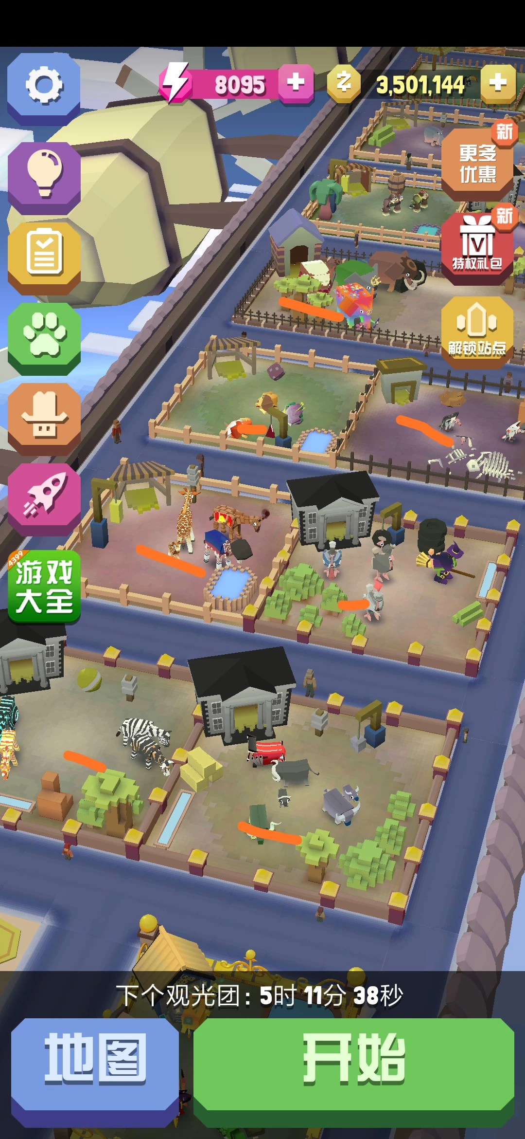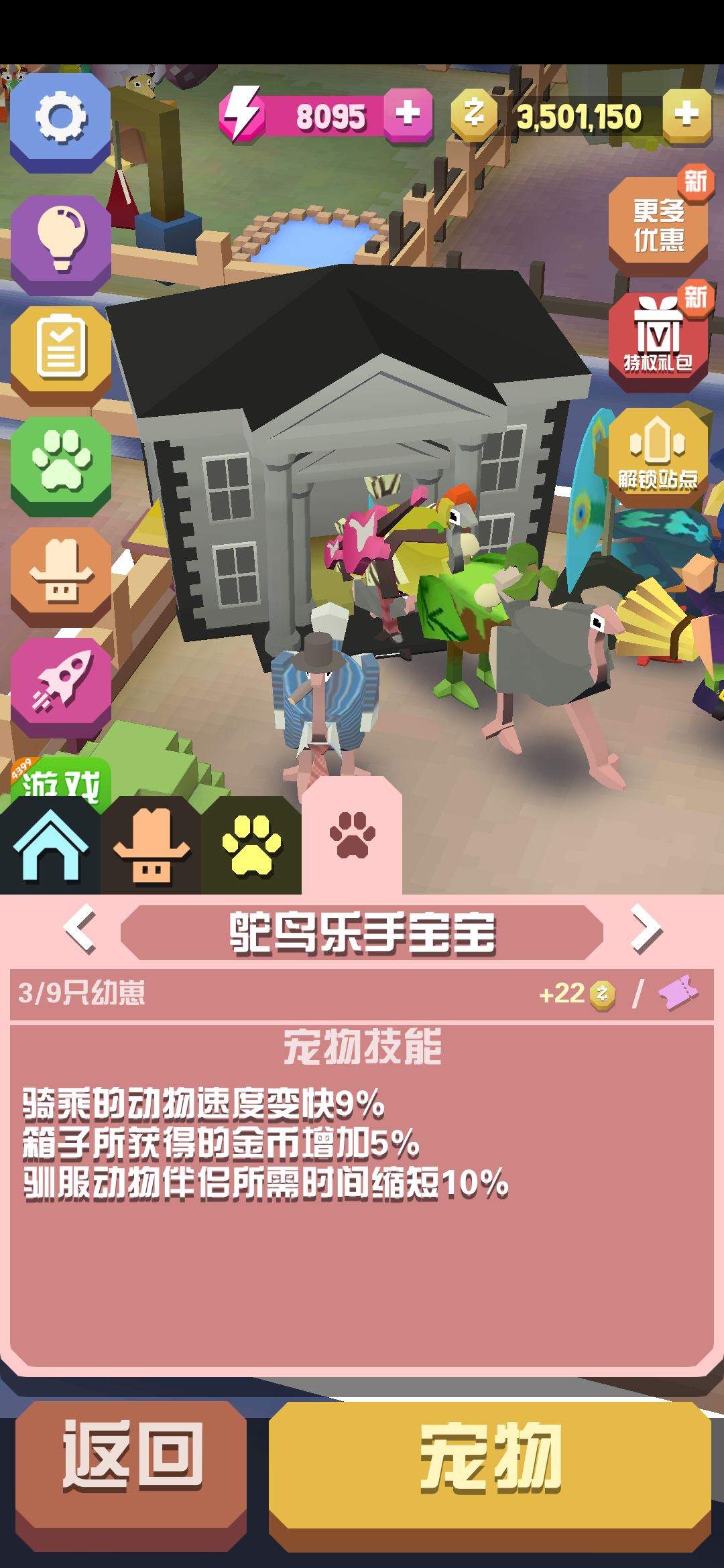 再就是遇到了新动物要尽可能的获得,驯服需要一段时间,屏幕中间有一个圆圈,转完一圈就可以,因为每种动物的品种有不少,获得的越多开门营业赚的钱越多。还有一个就是对于获得动物,在兽群中再次遇到可能会出现配对的字样,意思是可以进行交配生动物宝宝,动物宝宝可以跟随玩家出战,给玩家增加一些额外的buff,比如说加速,增加遇到稀有动物的几率。