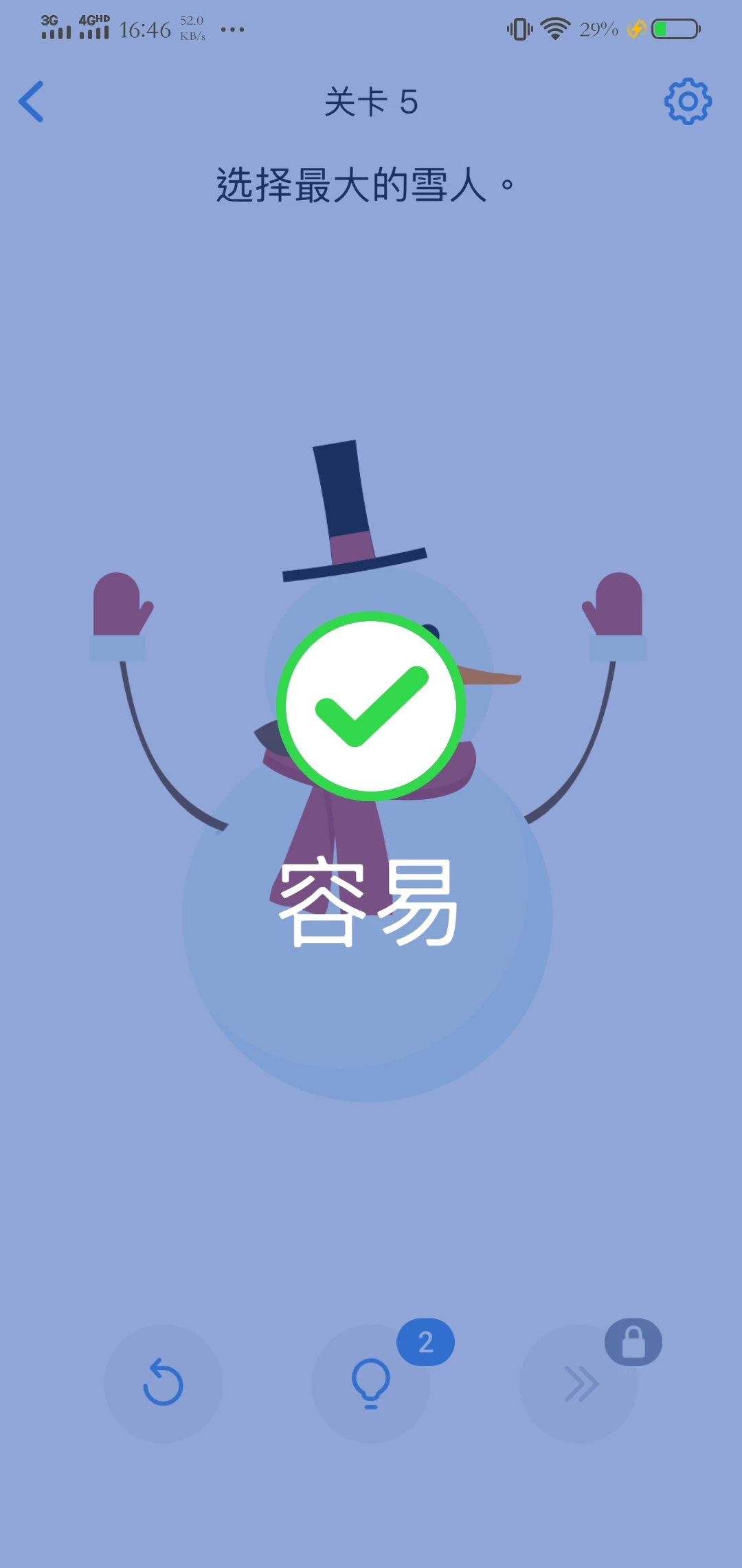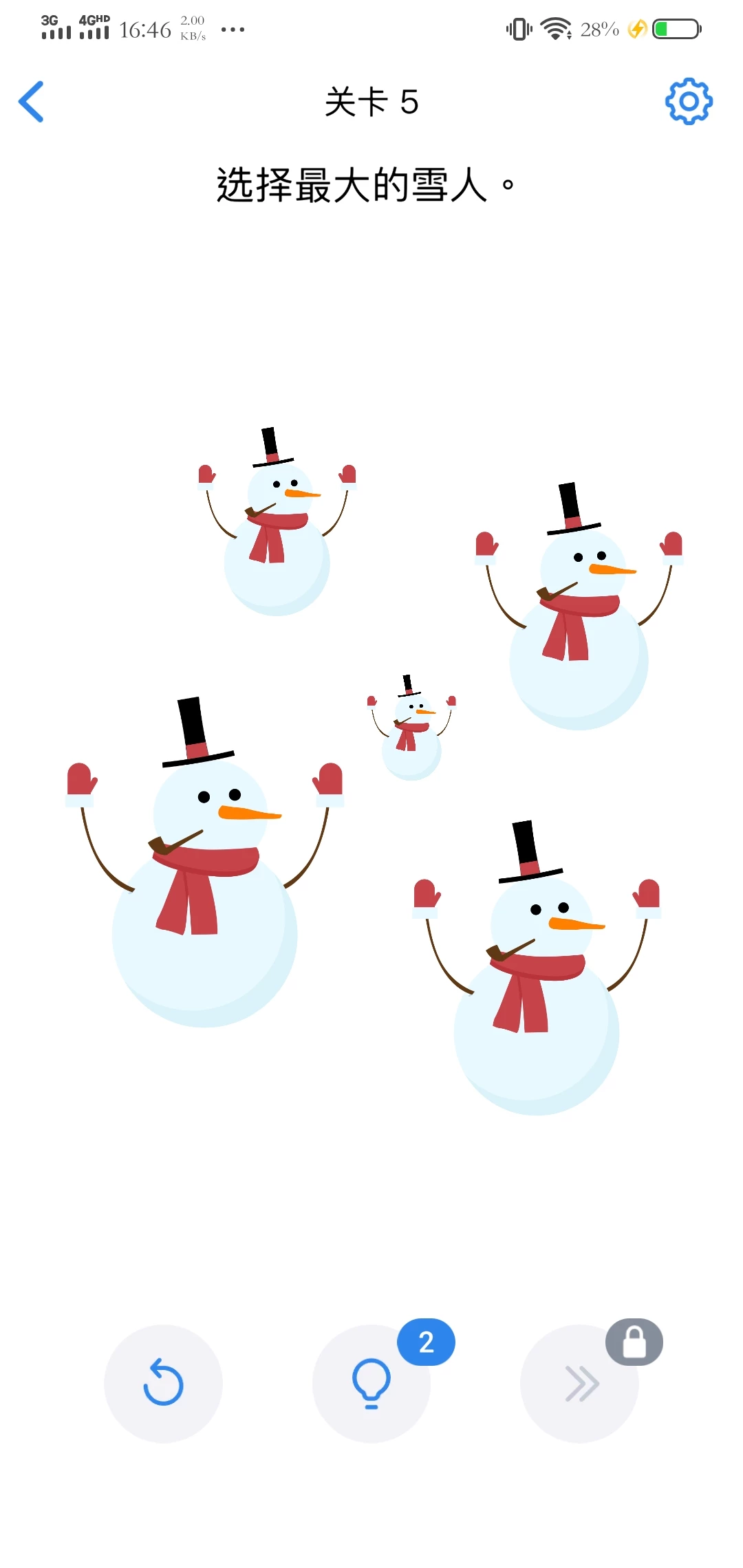 相比较而言,第五关就简单了许多,最大的雪人,一目了然,肯定是最左边的雪人最大嘛!emmm…竟然错了?容我在这里皮一下,这个关卡怎么可能这么简单,雪人是怎么做成的?当然是雪堆起来的了,把所有雪人都移到一个雪人身上,就会形成最终题目所要求的“最大的雪人”,知道真相的你们是不是感动的流出了眼泪?可能考虑到部分玩家智商不在线,提示功能也就应运而生,哪里不会点哪里,提示帮你解决问题!