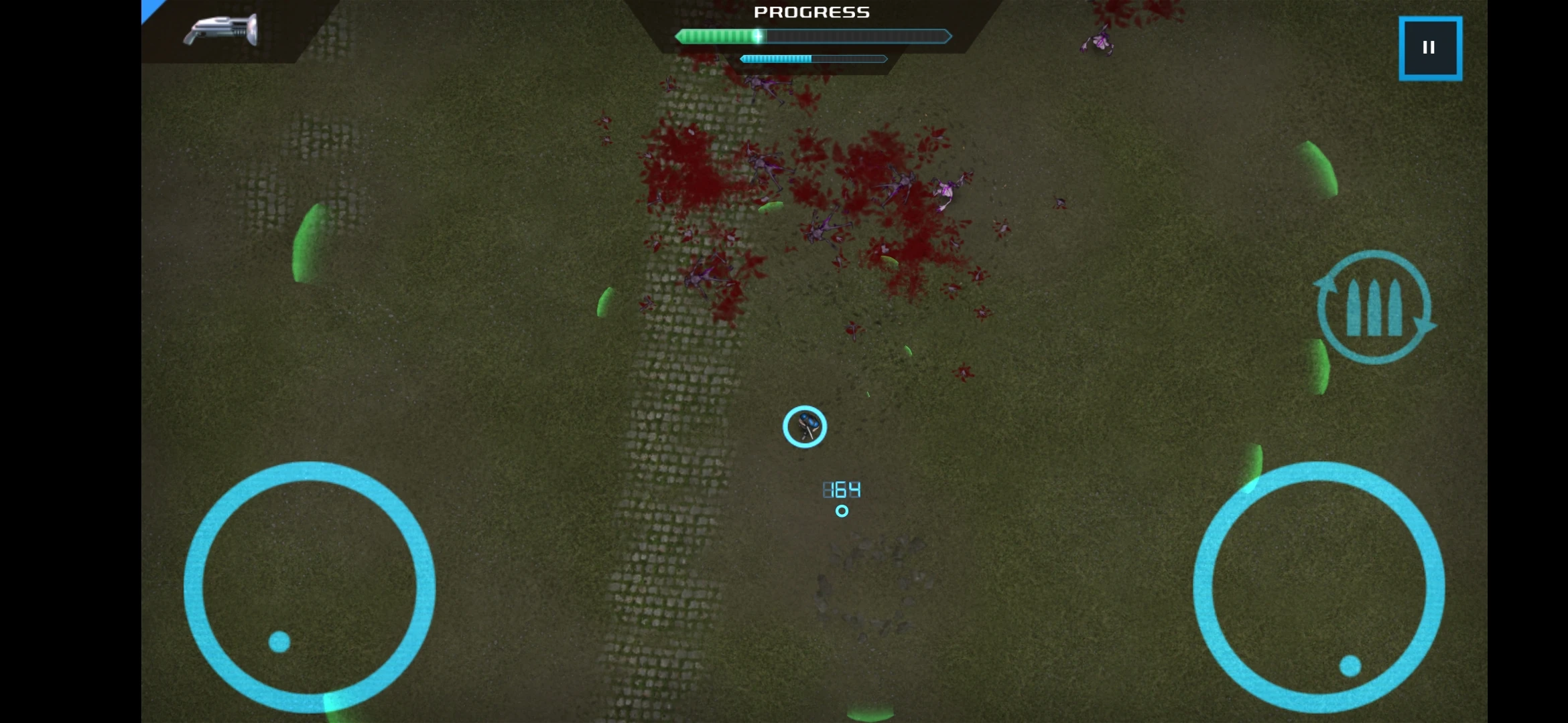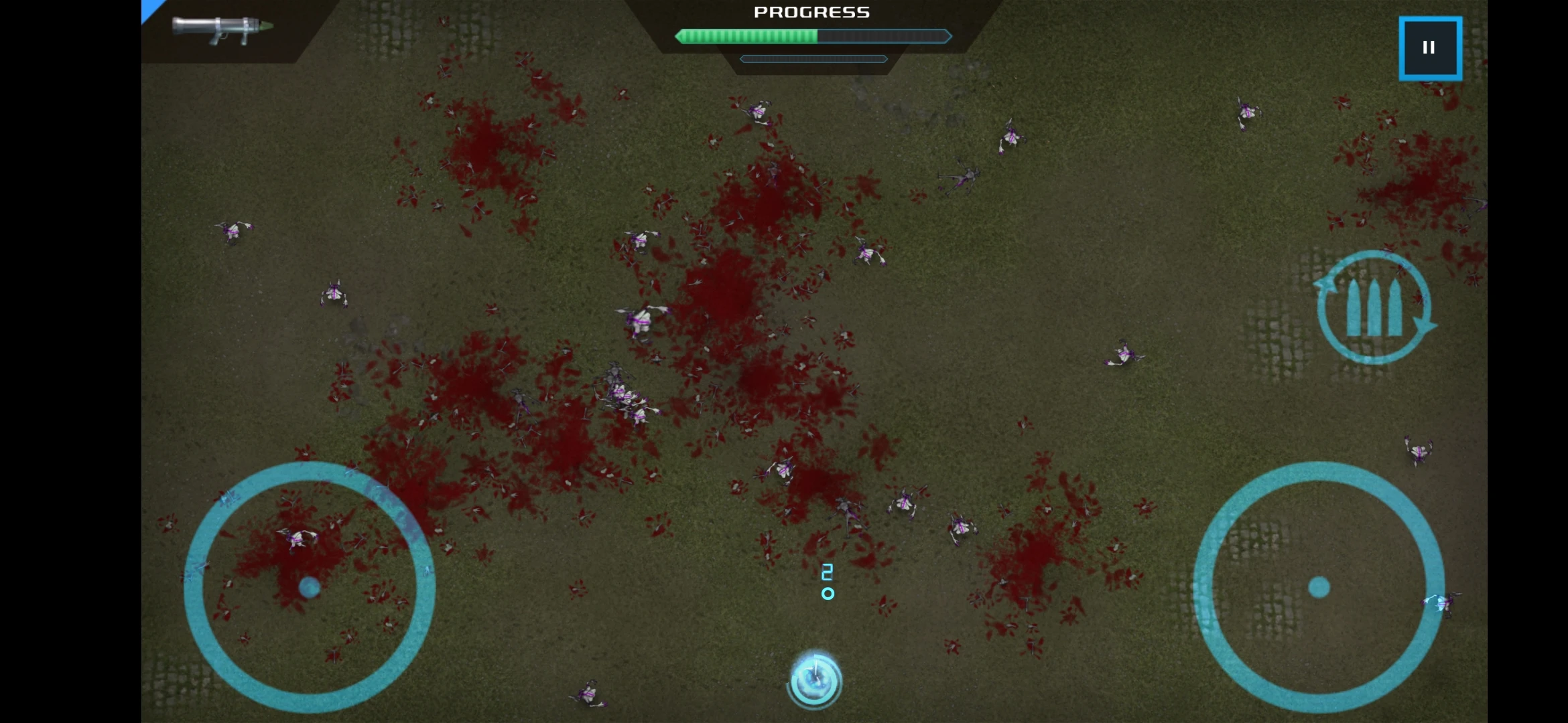 它的游戏背景被设定在孤岛之上,以一敌多的生存之道就是捡起武器保卫自己。第三人称的俯瞰视角给予了辽阔的视野同时也给予了敌军大量涌入的空间,子弹扫射的范围没有界限,不同的武器还有着不同的效用。关于武器此处应有大量篇幅,但我用三个字来概括:高科技。音波枪、缩小枪、喷火枪应有尽有,只有你想不到的,没有《血腥大地》做不出来的特效。