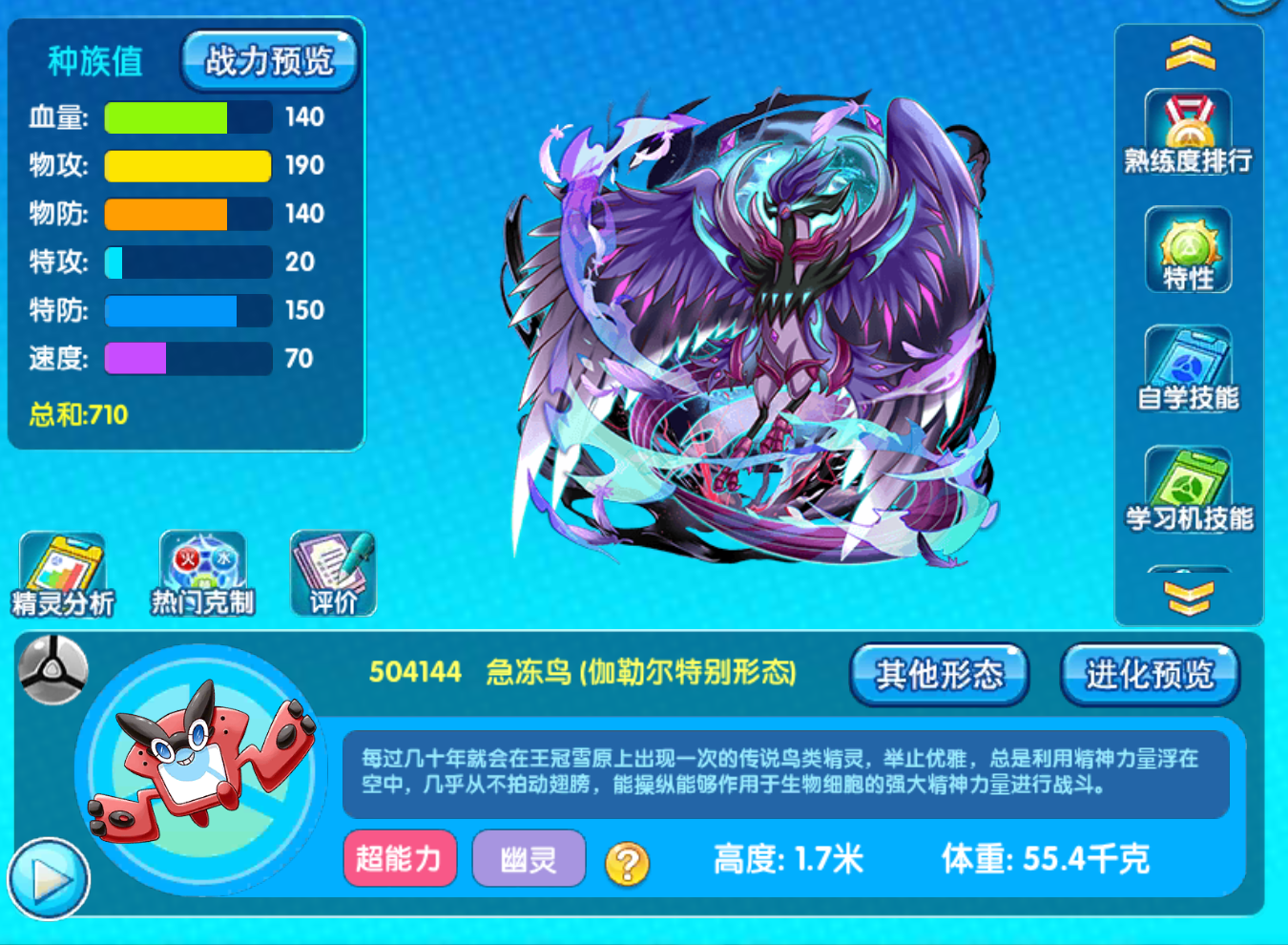 那么说完了关于这两个精灵的属性问题,那么就讨论一下这个精灵的种族值,整体来说,这个精灵种族值是700以上,血量方面很不错,超过了120这个血量线,伤害方面的话也是比较够看的,剩下的速度就是偏慢了一点,也不知道怎么回事,这两种属性搭配起来竟然不是一种速攻宠物,而是一种肉盾攻击宠物,整体来说,这个冰鸟的种族值就是偏向于能吃得起伤害,而且也能够反打一波,大概的情况就是你只要不把我秒杀,那么我就有机会把你给秒杀。