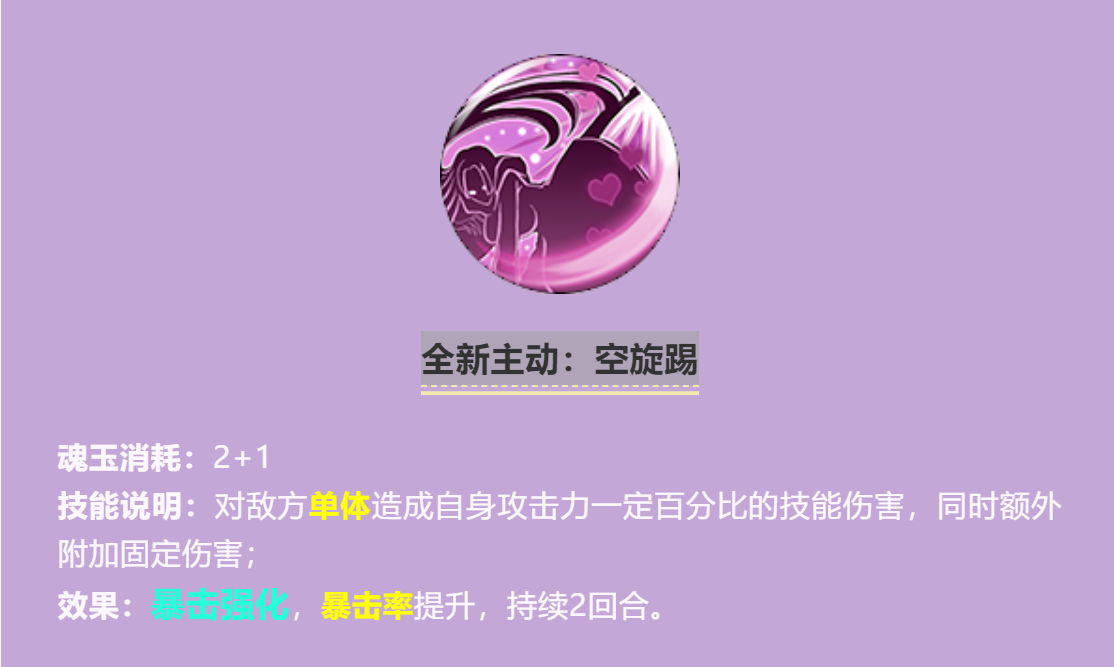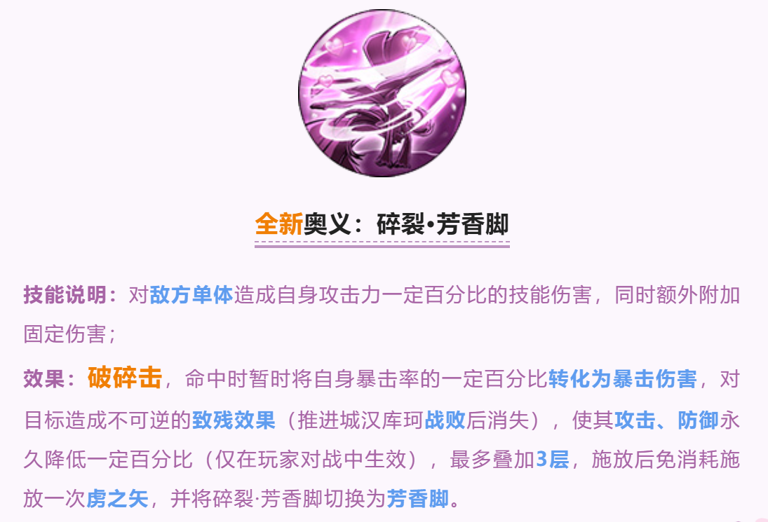 效果:破碎击,命中时暂时将自身暴击率的一定百分比转化为暴击伤害,对目标造成不可逆的致残效果(推进城汉库珂战败后消失),使其攻击、防御永久降低一定百分比(仅在玩家对战中生效),最多叠加3层,施放后免消耗施放一次虏之矢,并将碎裂·芳香脚切换为芳香脚。
