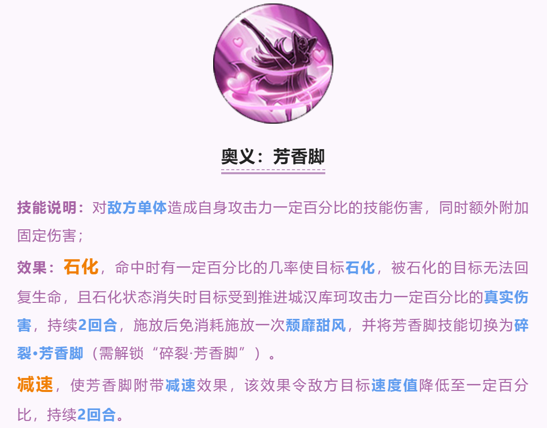 效果:石化,命中时有一定百分比的几率使目标石化,被石化的目标无法回复生命,且石化状态消失时目标受到推进城汉库珂攻击力一定百分比的真实伤害,持续2回合,施放后免消耗施放一次颓靡甜风,并将芳香脚技能切换为碎裂·芳香脚(需解锁“碎裂·芳香脚”)。