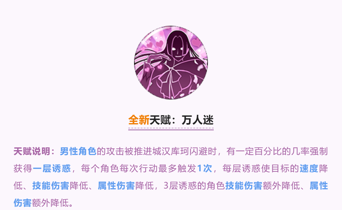 天赋说明:男性角色的攻击被推进城汉库珂闪避时,有一定百分比的几率强制获得一层*,每个角色每次行动最多触发1次,每层*使目标的速度降低、技能伤害降低、属性伤害降低,3层*的角色技能伤害额外降低、属性伤害额外降低。