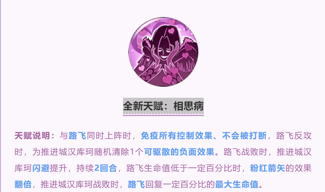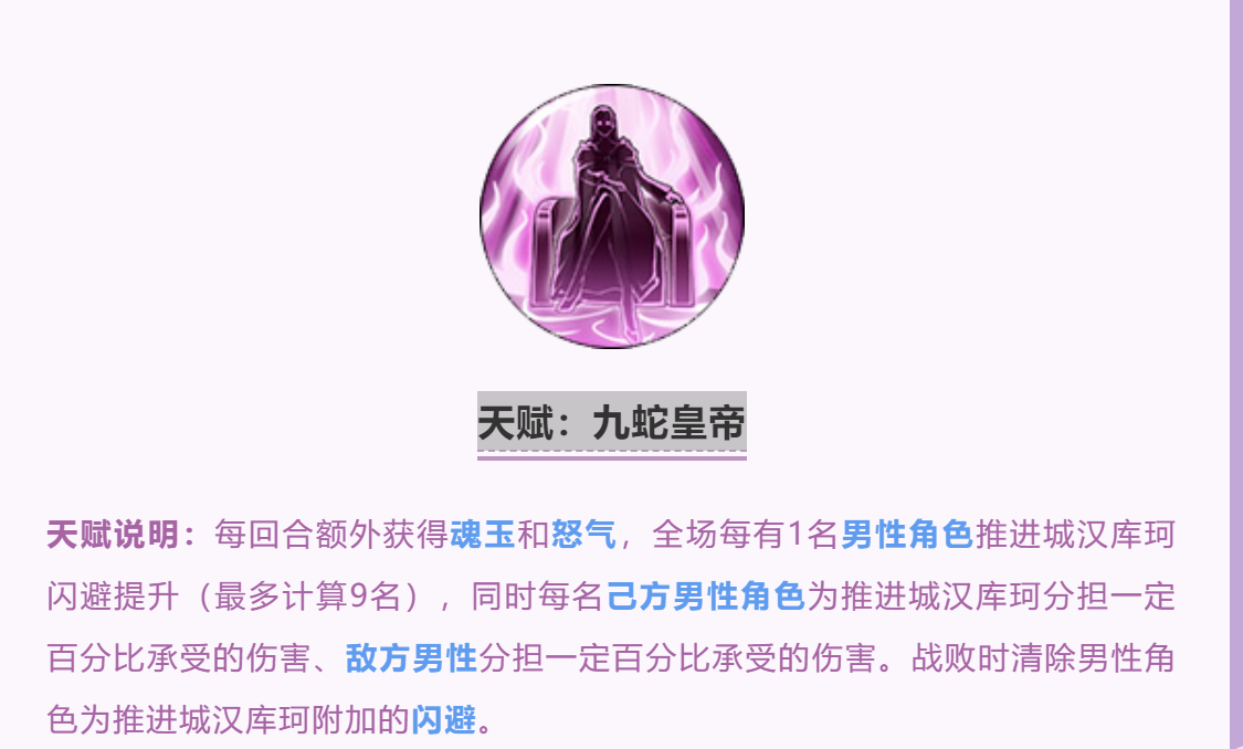 天赋说明:每回合额外获得魂玉和怒气,全场每有1名男性角色推进城汉库珂闪避提升(最多计算9名),同时每名己方男性角色为推进城汉库珂分担一定百分比承受的伤害、敌方男性分担一定百分比承受的伤害。战败时清除男性角色为推进城汉库珂附加的闪避。