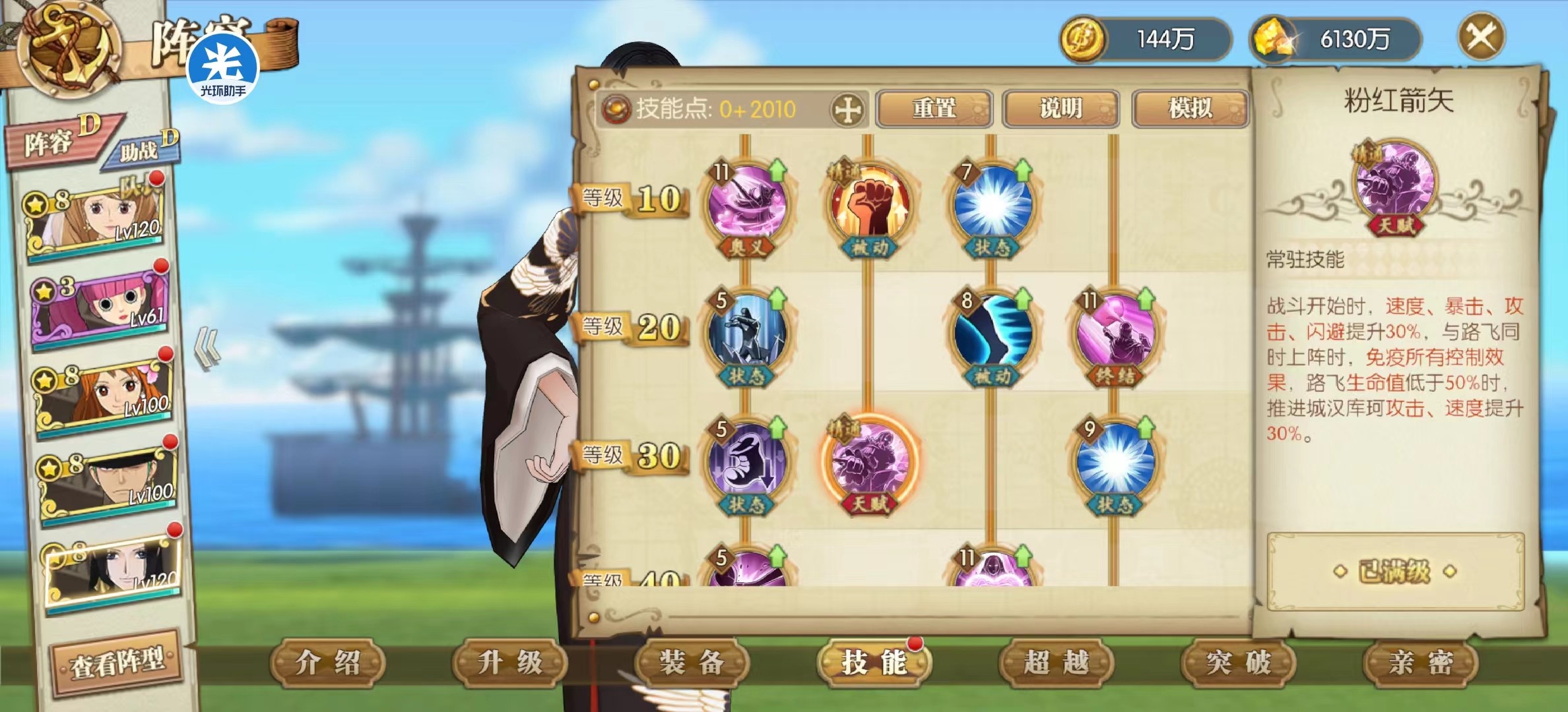 这里我们来看看粉红箭矢正式服版本女帝的一个加成,速度、攻击、暴击、闪避提升30%,但是原来是写路飞生命低于50%,女帝攻击速度提升30%,觉醒后的是直接翻倍了,其实也是一样的,30%的翻倍其实就是加30%嘛哈哈哈!