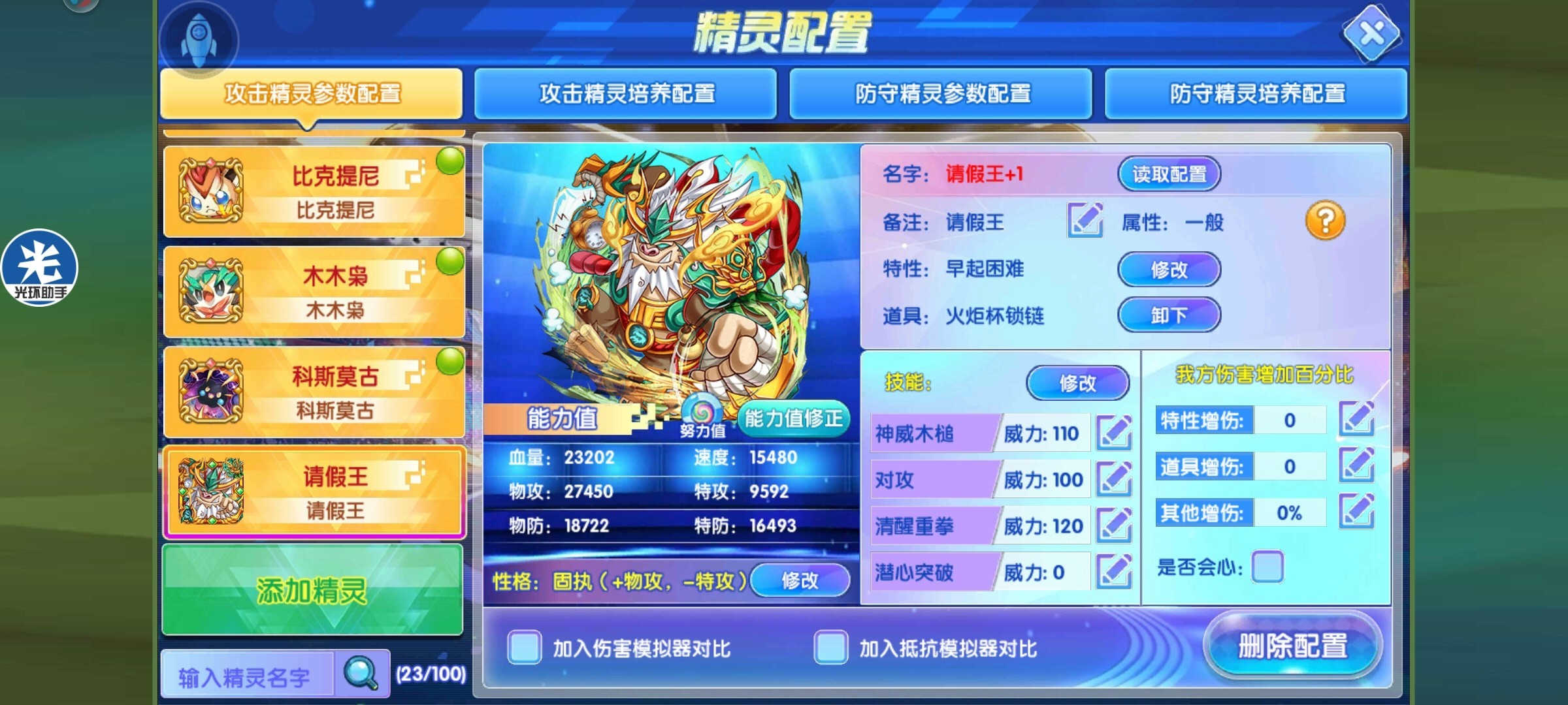这是在精灵配置中满配的一个面板,从这我们可以明显看出27450的物攻,血量也有23202,双防也在一万八与一万六。超高的数值让请假王可以比较容易站场输出。不过因为抗性不是很好,在遇到高暴发的克制伤害(比如六层的走地鸡破坏轮锤)还是要靠队友联防的。