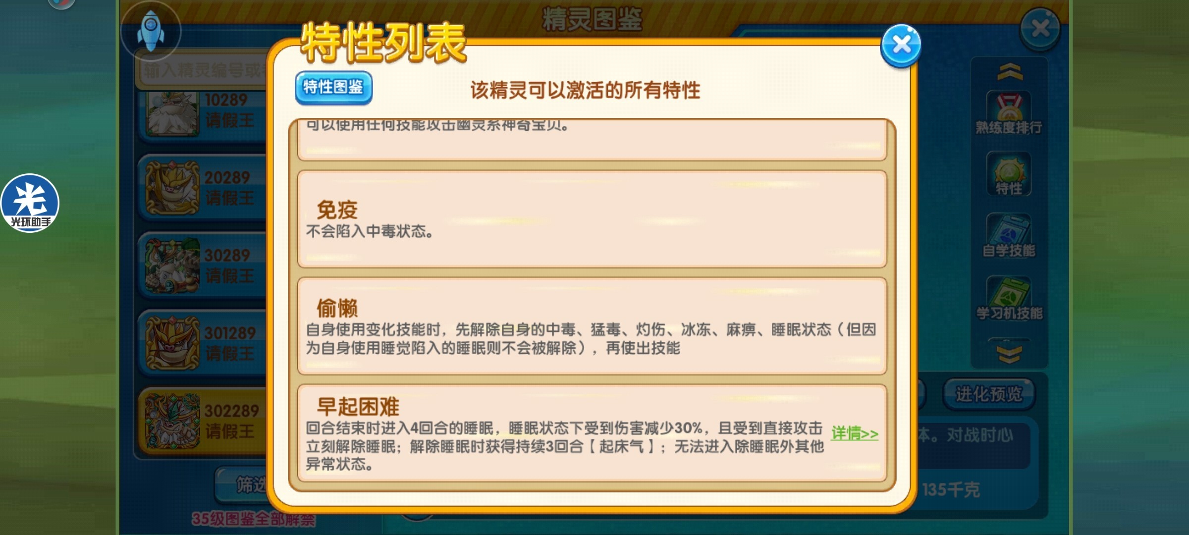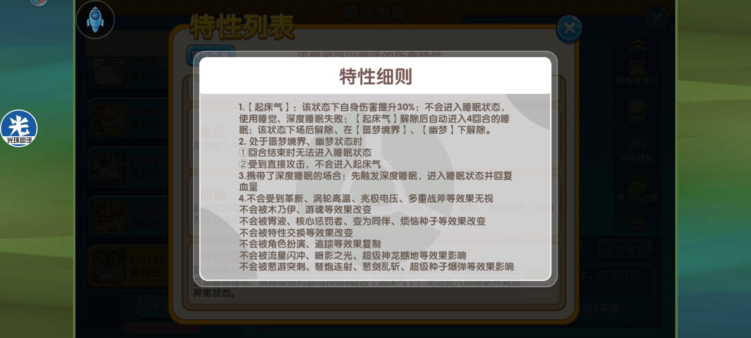 这个特性,在回合结束后会进入4回合的睡眠状态,在睡眠状态下受到伤害减少30%,且受到直接攻击就会立刻解除睡眠状态,解除睡眠状态后会进入3回合起床气状态。除此还无法进入除睡眠状态外的其他异常状态。