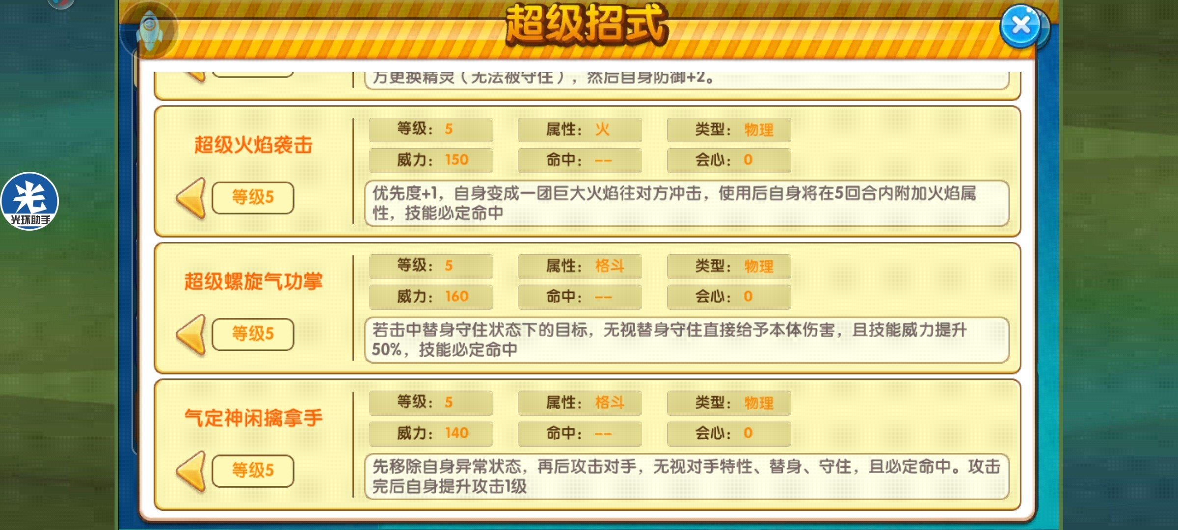 清醒重拳/梦话;潜心突破/懒惰; 大力巴掌/对攻/神威木槌/盖亚冲击/沙海风暴/