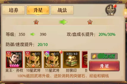 武将的升星突破,能提升40级的等级上限,攻击血量提升20%/30%,防御速度提升20/10,大大提升武将的各项属性,让原本到达瓶颈的武将强度跟上一层。