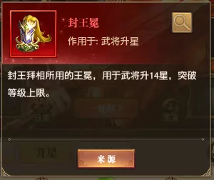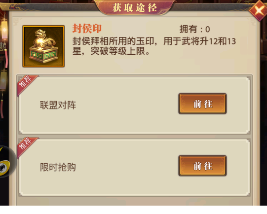 相信各位主公都不陌生吧,封侯印主要为武将升12-14星时,突破等级上限的材料。在游戏中封侯印的获取来源和封王冕类似,通过参与联盟对阵活动,在活动的联盟商城购买,在限时抢购的礼包中也有封侯印。