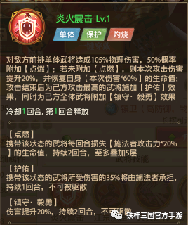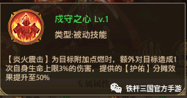 【戍守之心】效果:【炎火震击】为目标附加点燃时,额外造成一次伤害,并且强化了【炎火震击】的(护佑)效果 ,由35%提高至50%,可以更加有效的保护到我方输出武将。
