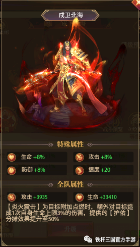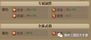 全队属性满级加成:攻击+3935 生命+33410(不上阵也有全体武将属性加成)