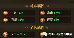 专属属性满级加成:生命+8% 攻击+8% 防御+8% 速度+20