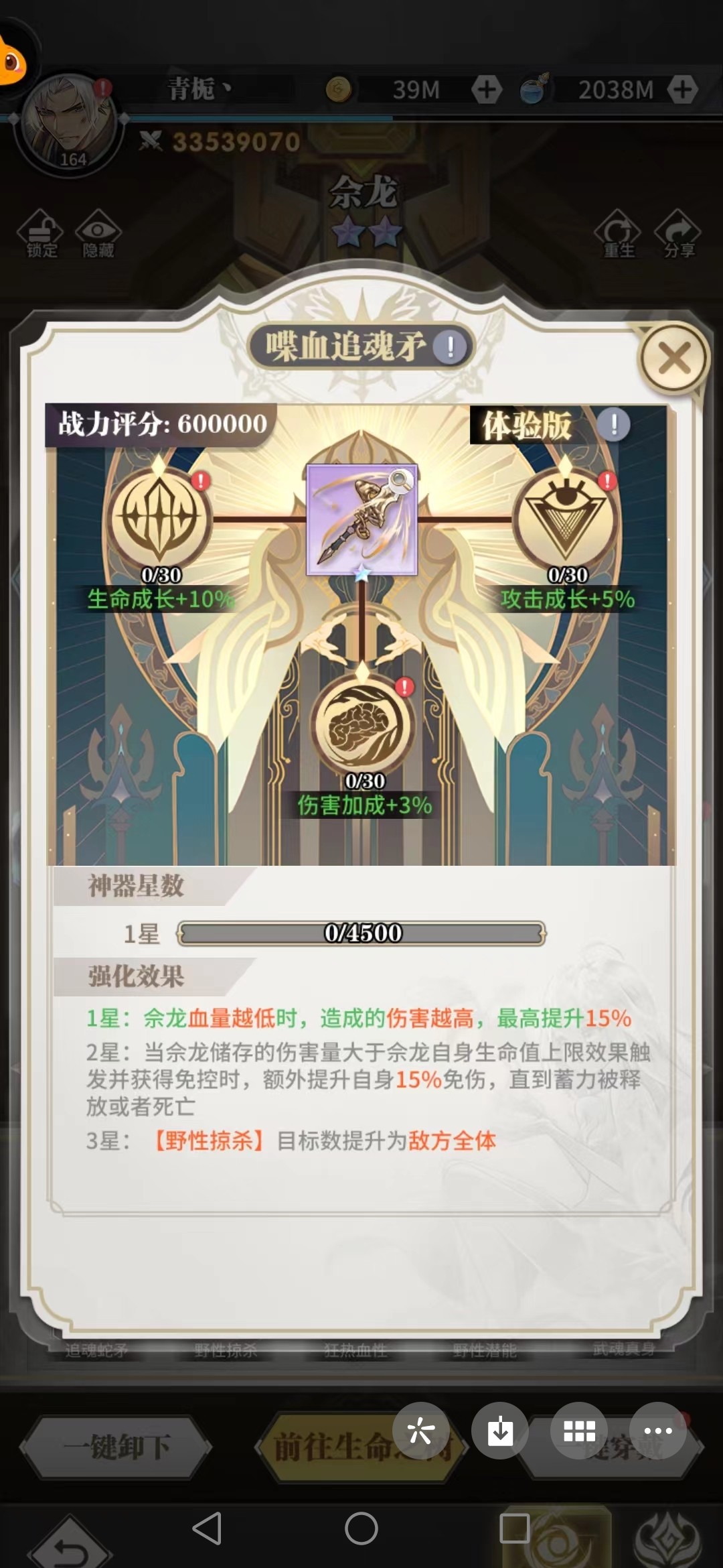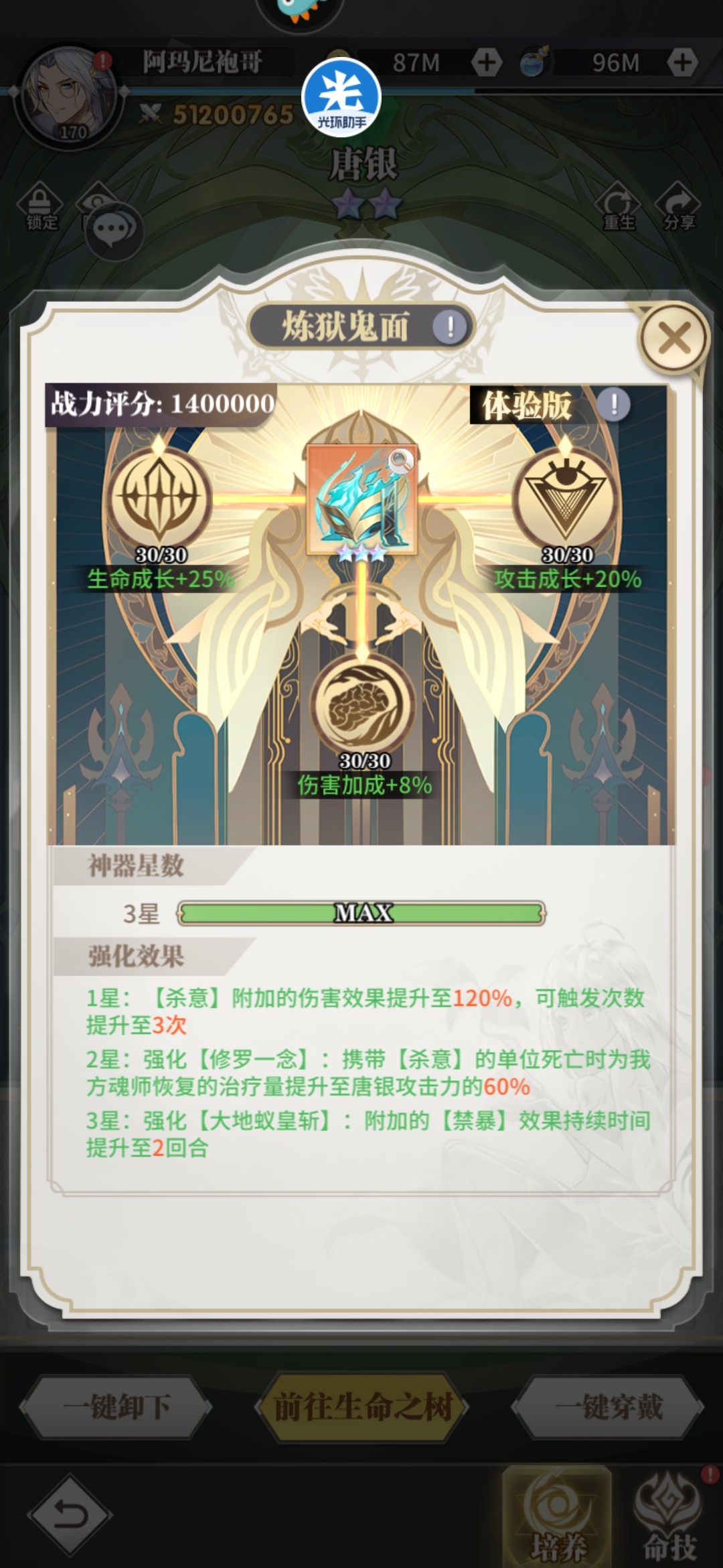 ②、强化【修罗一念】:携带【杀意】的单位死亡时为我方魂师恢复的治疗量提升至唐银攻击力的60% ③、强化【大地蚁皇斩】:附加的【禁暴】效果持续时间提升至2回合