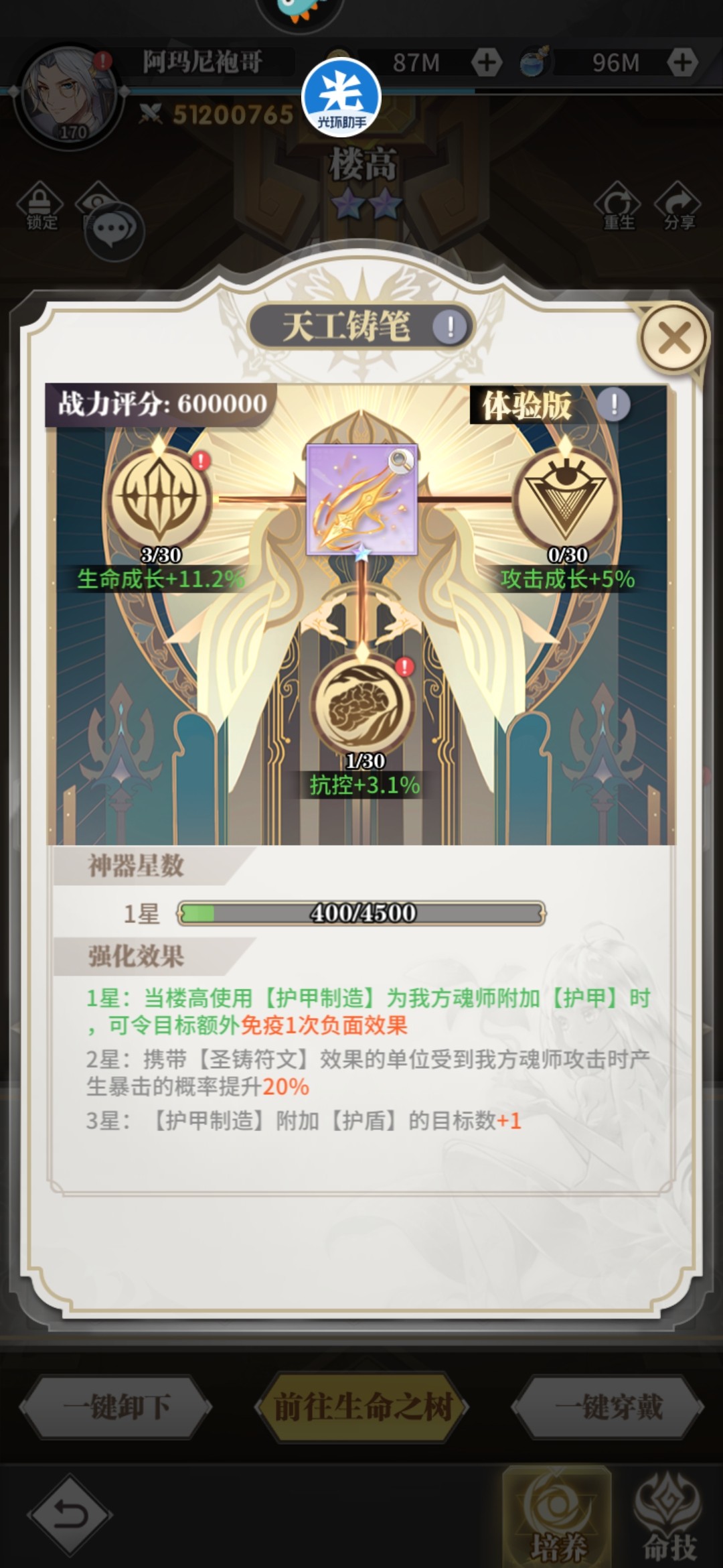 ①、当楼高使用【护甲制造】为我方魂师附加【护甲】时,可令目标额外免疫1次负面效果