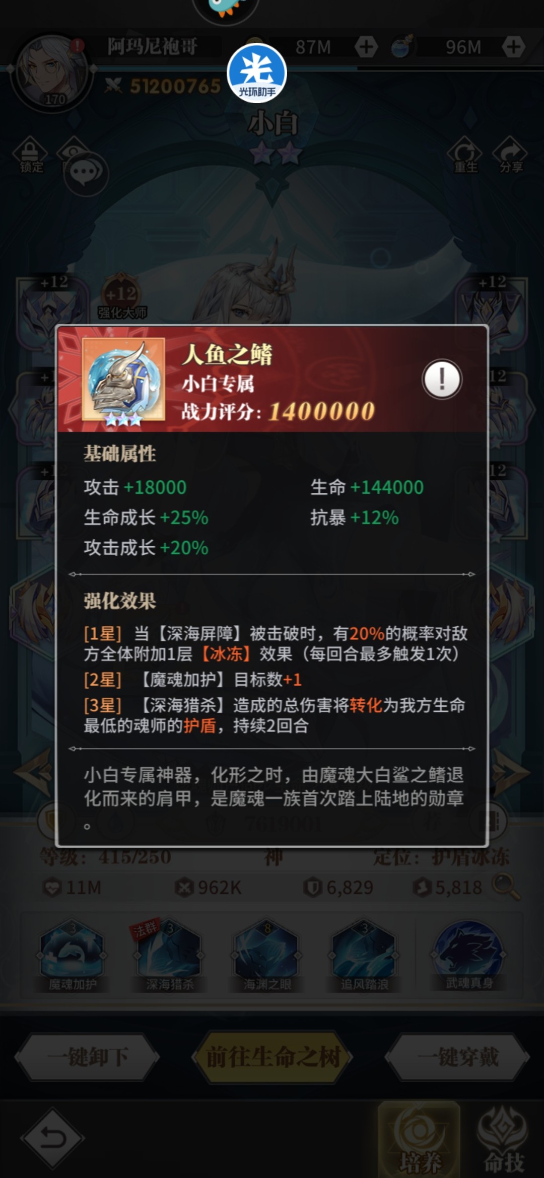 ③、【深海猎杀】造成的总伤害将转化为我方生命最低的魂师的护盾,持续2回合