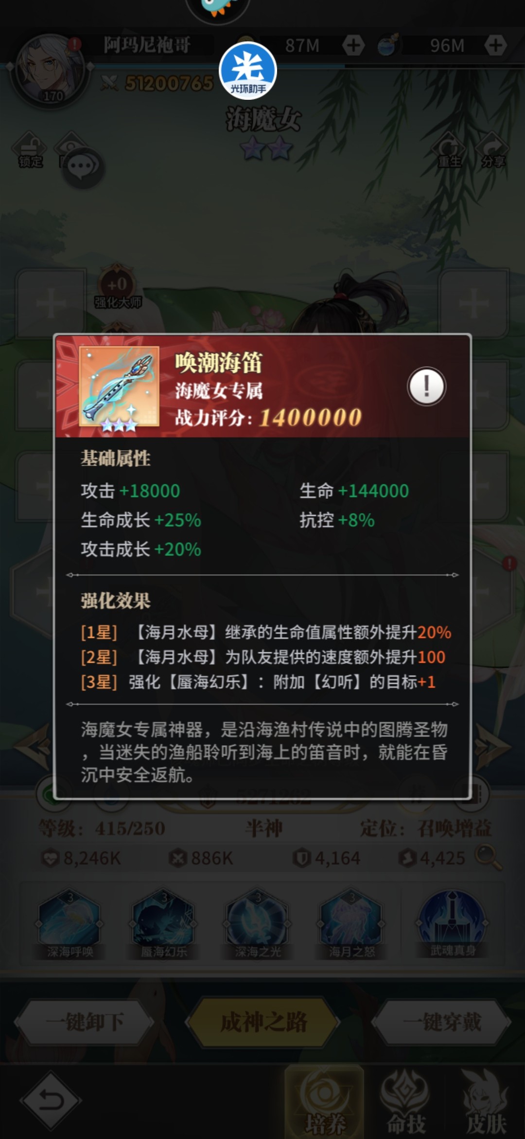 ①、【海月水母】继承的生命值属性额外提升20% ②、【海月水母】为队友提供的速度额外提升100 3③、强化【蜃海幻乐】:附加【幻听】目标+1