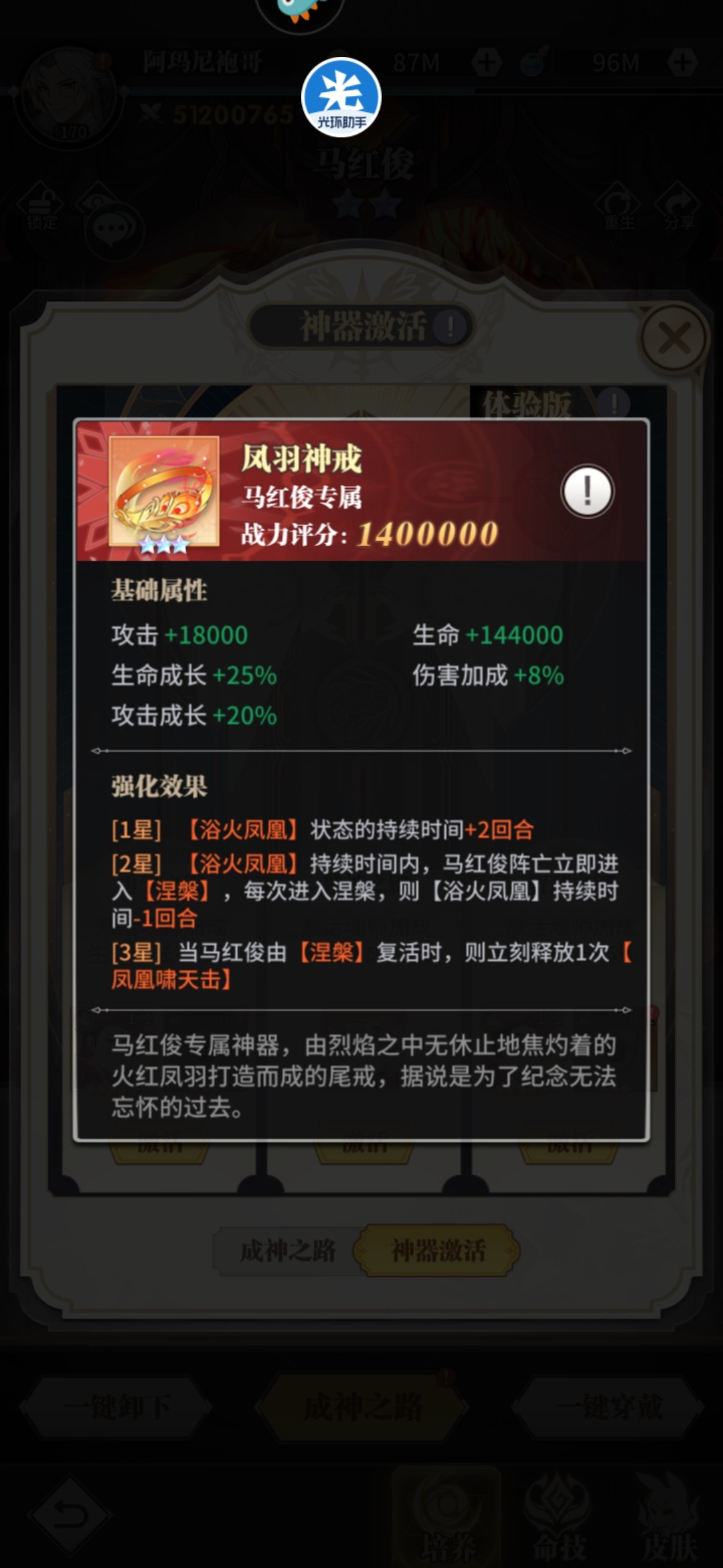 ③、当马红俊由【涅槃】复活时,则立即释放1次【凤凰啸天击】