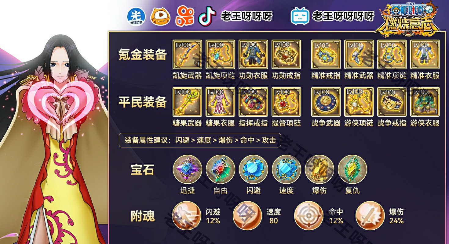 平民装备的话老王推荐还是闪避优先,随机闪避武器,然后是双闪糖果衣服、双闪指挥戒指、双闪提督项链,当然如果没有的话使用高速爆伤也行,但是生存就有点难受了。(女帝的闪避有点迷,有的时候80打不中,有的时候100直接白胡子一巴掌带走,所以老王还是看着难受啊!)