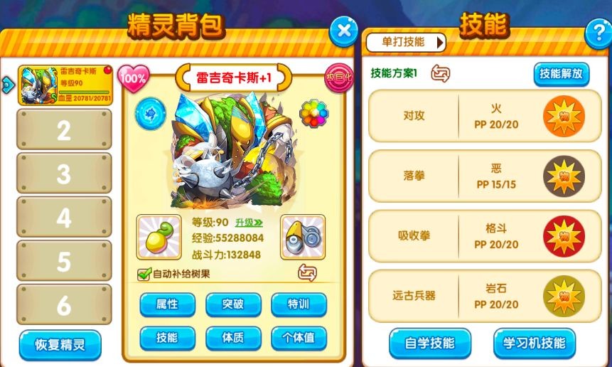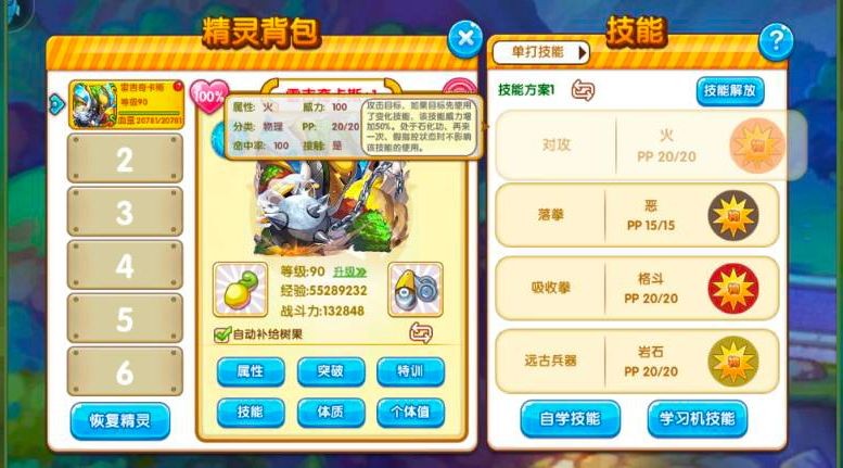 已有效果:技能远古兵器的属性变为火,50%概率降低对方的物防1级。额外效果:自身属性变为火,使用非本系技能伤害提升80%。火系是这个版本算是比较好的属性,能打椰蛋树也能殴打溜溜球皮卡丘。最主要的是,使用非本系技能伤害提升百分之80,这是个什么概念呢,就等于三个本系加成的伤害,所以非常的变态。