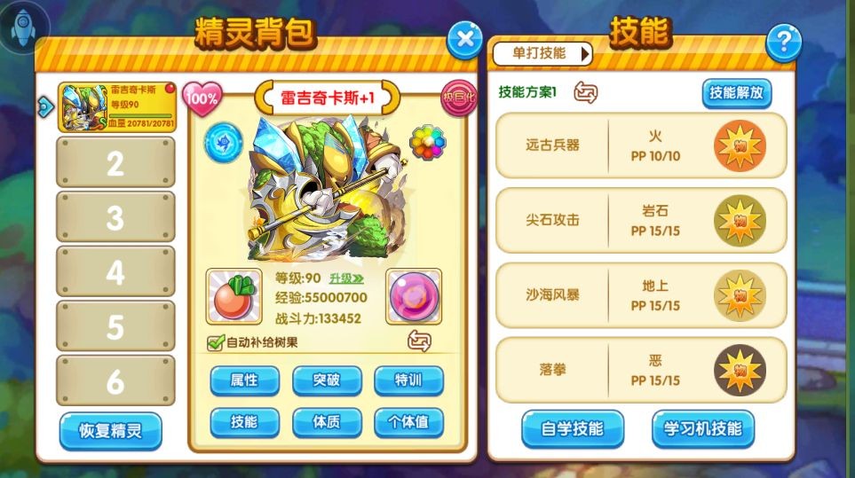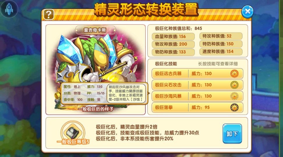 我选择的是激活携带巨星锤,岩石系作为pvp环境中也是十分优秀的打击面,而我为什么选择携带巨星锤呢,大家请看(携带巨星锤:已有效果:技能远古兵器的属性变为岩石,50%概率降低对方的特防一级;额外效果:自身属性变为岩石,会心+2级,会心伤害增加30%)。