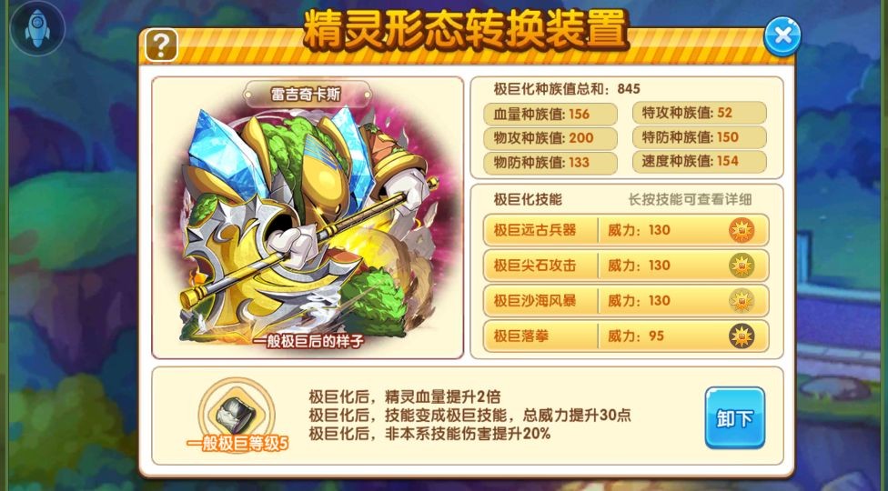 已有效果:技能远古兵器的属性变为火,50%概率降低对方的物防1级。额外效果:自身属性变为火,使用非本系技能伤害提升80%。3.携带巨锤