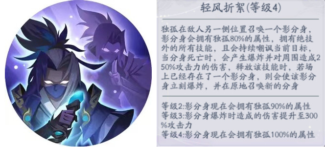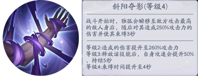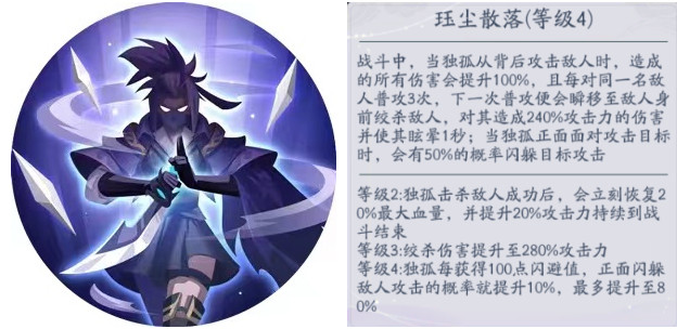 看得出来这次官方比较用心设计了,刺客嘛,就应该体现出一点背后阴人的感觉,普通的刺客大多数就是什么对敌方造成一定伤害啊,然后升级就增加攻击百分比等等,独孤一门的这个技能设计出了两种攻击方式。