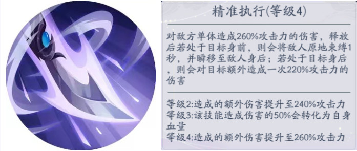 刺客的必备技能,如果没有这种优先级很高的切入技能,那么刺客更是轮流为下水道了,与其他刺客大体一致,具备起手压制敌方单核输出角色,只要对面没有带神农鼎,基本中了这个技能后再搭配两个其他技能与普攻就可以带走。