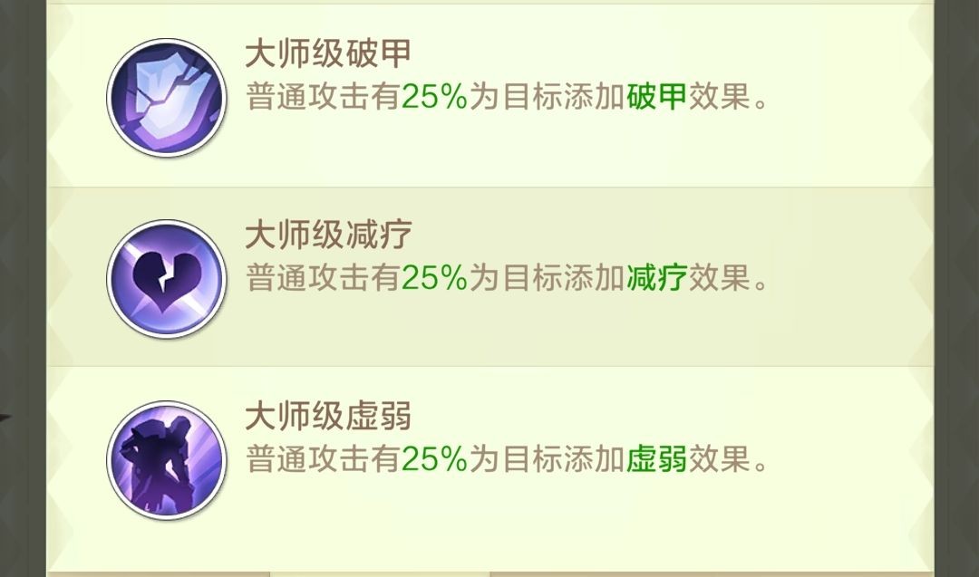 ✨普通攻击的虚弱,嘲讽和净化,是和普攻目标多的和持续普攻的英雄,如元素之主的普通攻击为全体,赤天龙骑的普通攻击为前中排,都可以让这些技能最大化发挥。