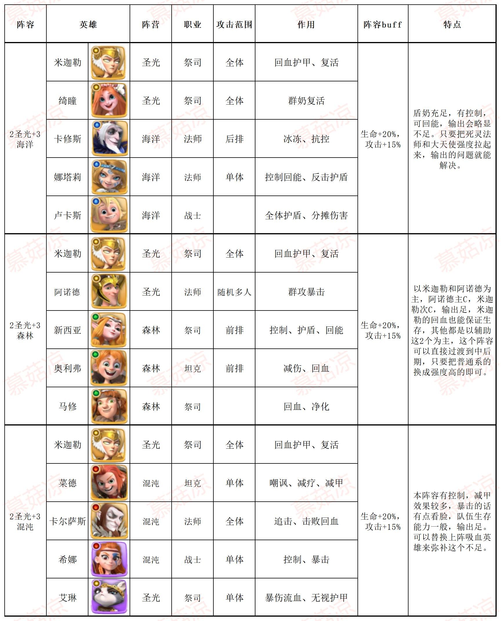 先选定盾和主力输出,其他的围绕这2个英雄的同阵营英雄选就好了。优先考虑5个同阵营的(5个同阵营的加成最高),条件不够就凑个3+2的阵营buff也行。例如:前排盾选的奥拉夫,那么输出就考虑武藏、兰德尔、梅丽尔等。圣光和幽暗阵营的英雄一般强度都不错,可以考虑优先培养。