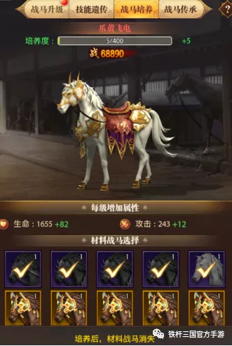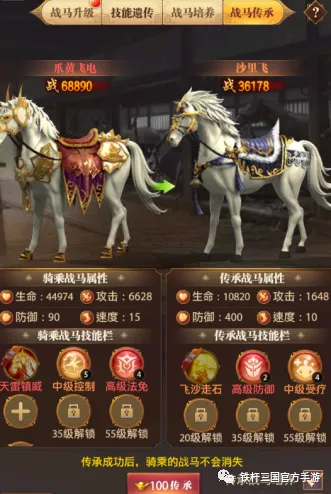 战马的养成主要分为战马升级、技能遗传、战马培养和战马传承四大部分。战马升级和战马培养提升的都是战马的生命和攻击;战马传承是方便玩家替换战马或战马技能使用的。