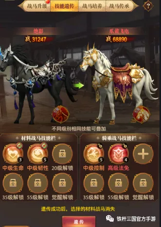 技能遗传,顾名思义就是选择一匹战马的技能,遗传到武将装备的战马身上,这里十分考究技能搭配。