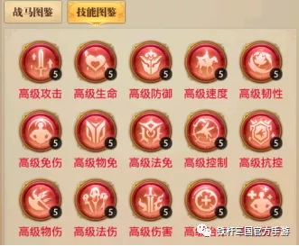 方士马:高级免伤、高级物免、高级速度、中级免伤、中级物免、中级速度。