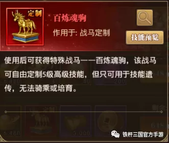 除了战马可以获取战马技能外,各位君主也可以通过使用百炼魂驹直接定制技能,省去筛选和抽取战马等待合适技能的麻烦,如果君主想要高级速度等技能,则需要使用更高级的千锤魂驹。