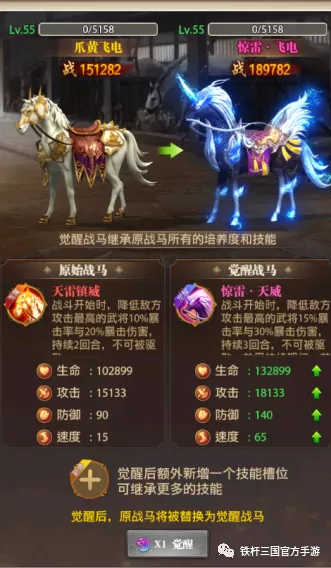 除了技能遗传外,战马还能进一步觉醒,给武将带来更高的属性加成。