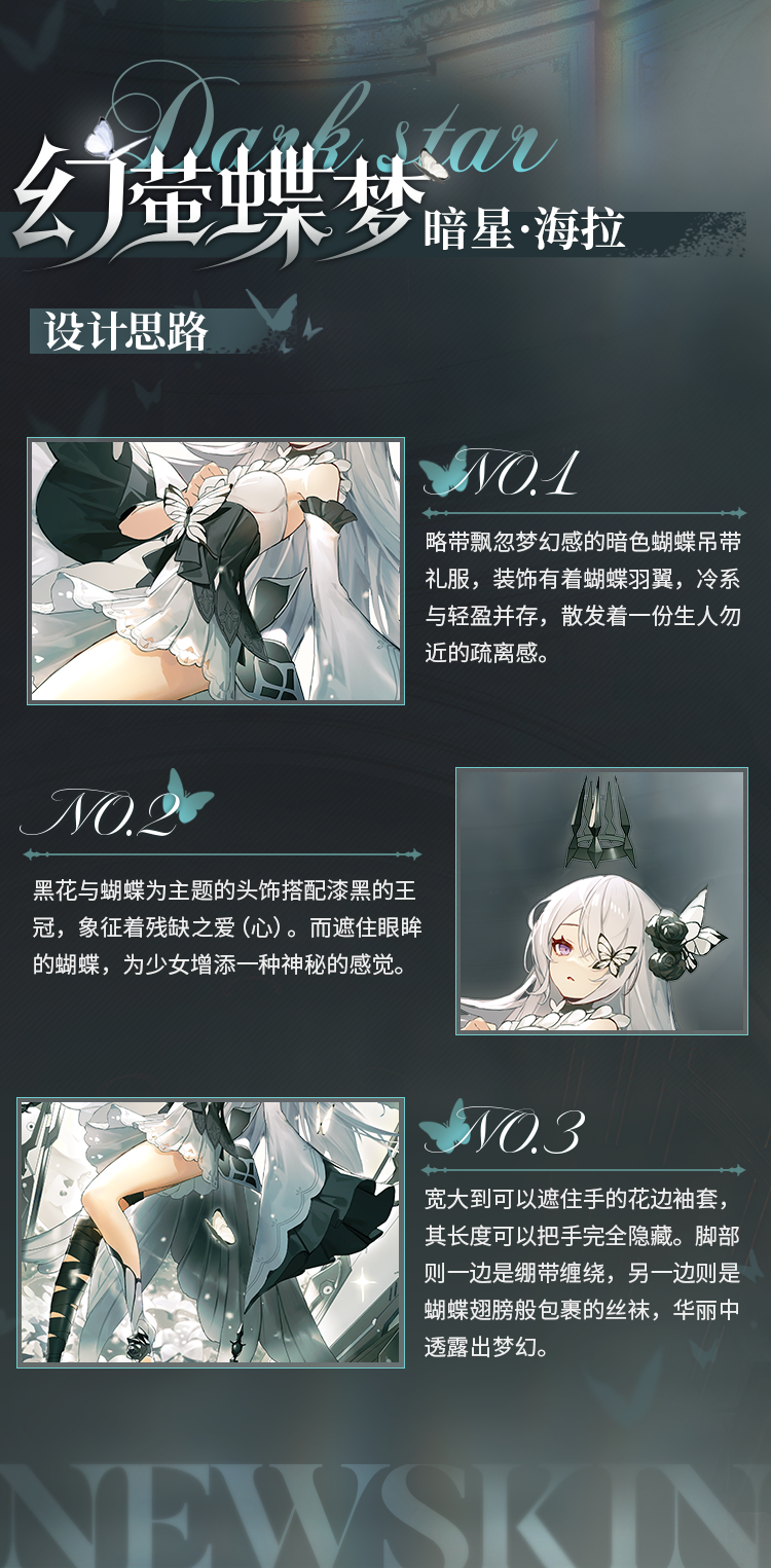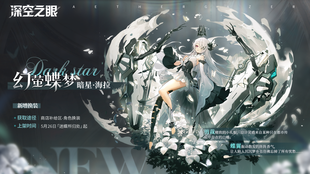 新增换装|暗星·海拉限时换装【幻萤蝶梦】小光高能速递发布于 2022-05-23关注亲爱的管理员们好呀! 暗星·海拉全新限时换装【幻萤蝶梦】将于5月26日版本更新后登场! 只在墓园飞舞的冥幻之蝶,人们常常将它和都市传说中的葬仪人联系在一起。 蝶翼振动散发的阵阵香气,让人陷入沉沉梦乡也仿佛忘掉了所有忧愁。