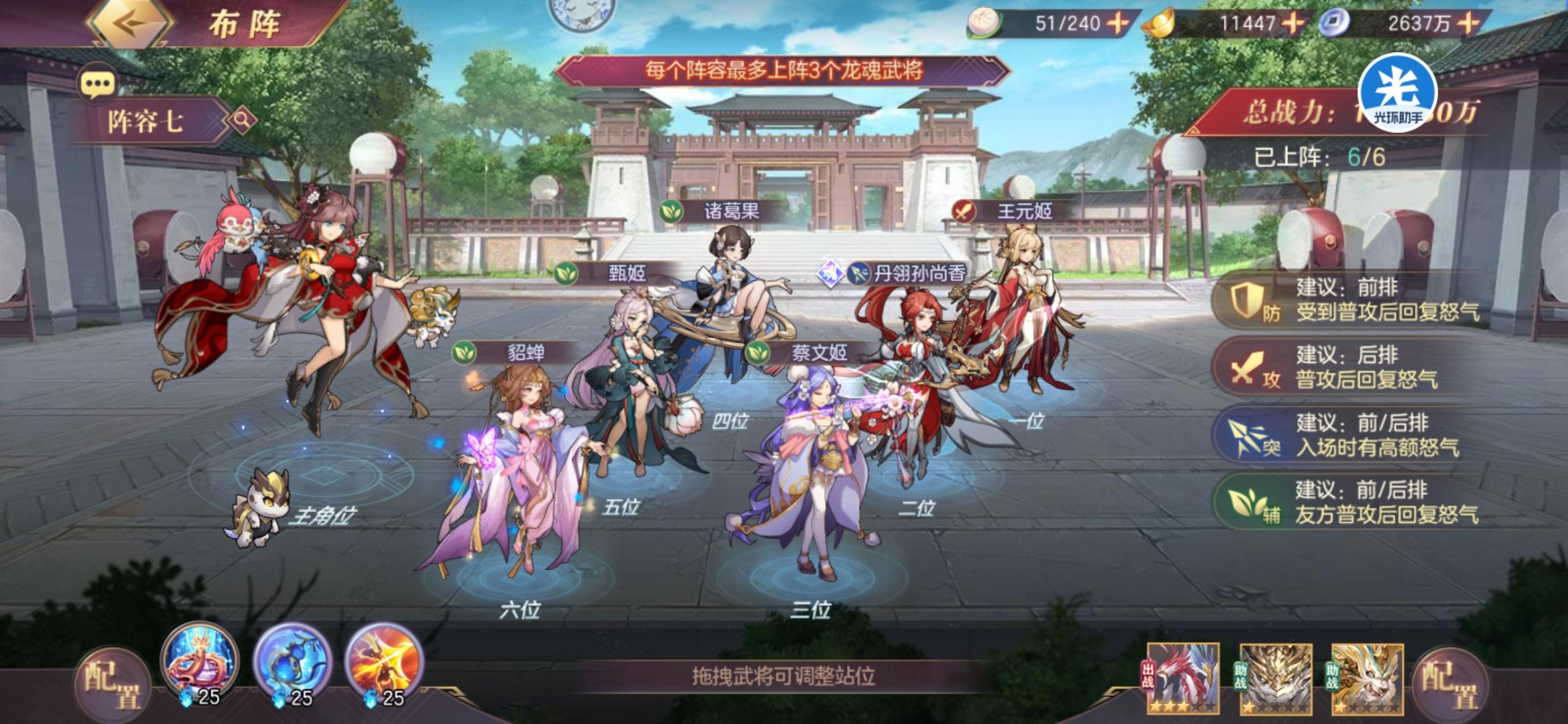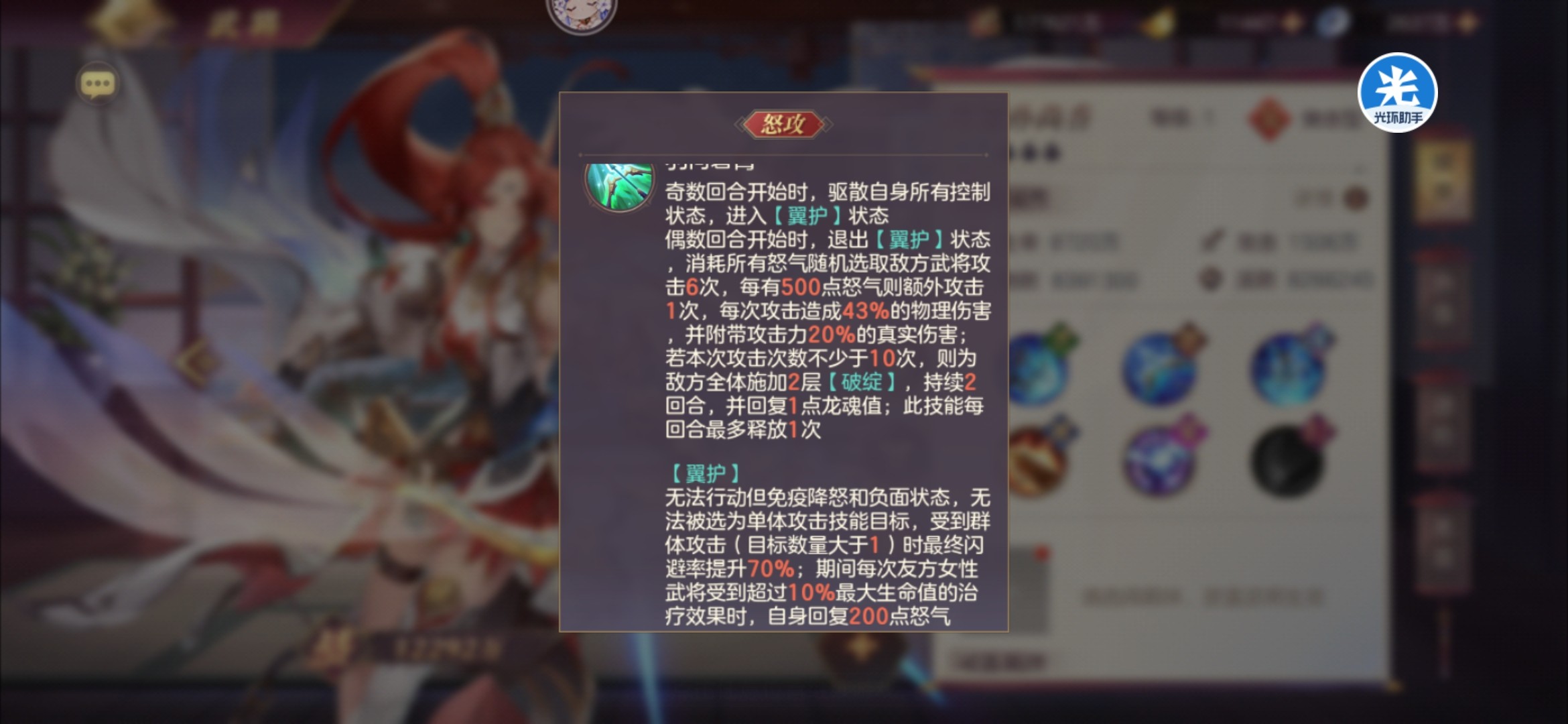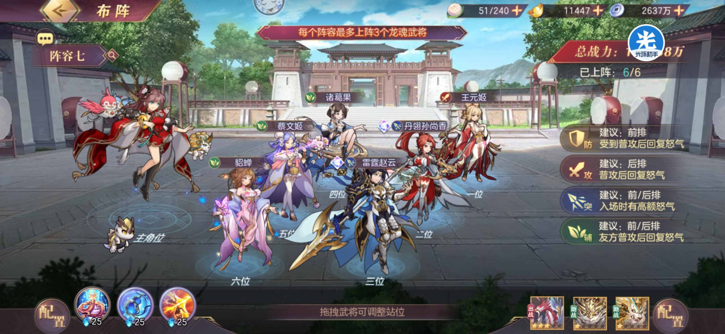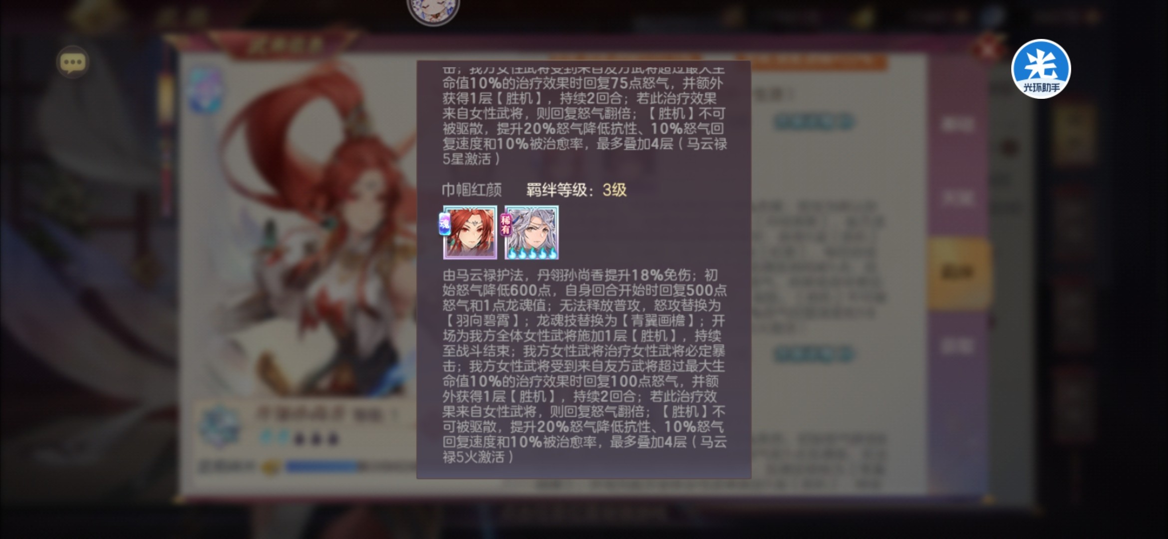 阵容思路主要是通过魂将香香(马云禄羁绊)的提供的大量buff,达到怒气上的压制,配合王元姬蔡文姬的回复达到多次怒攻的效果,并通过多种方式控怒