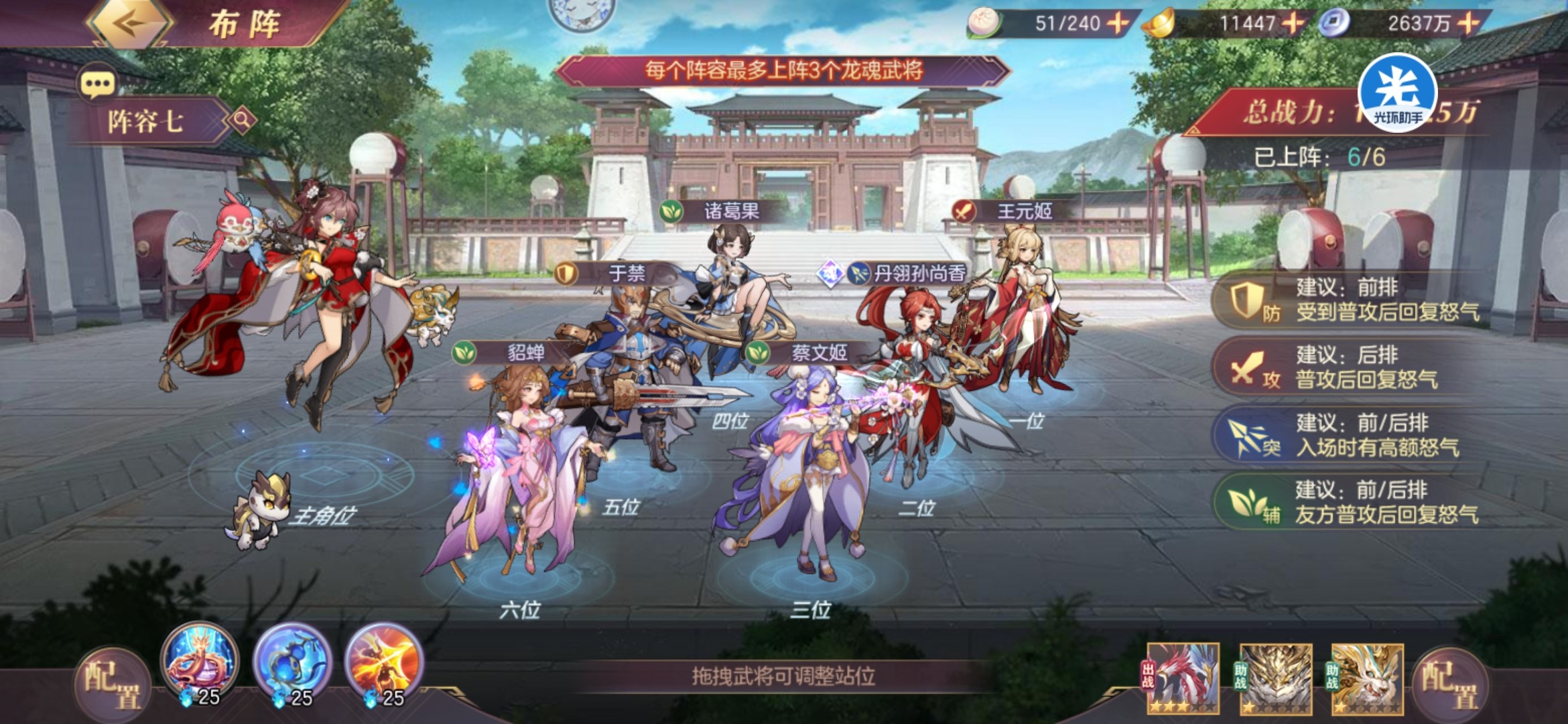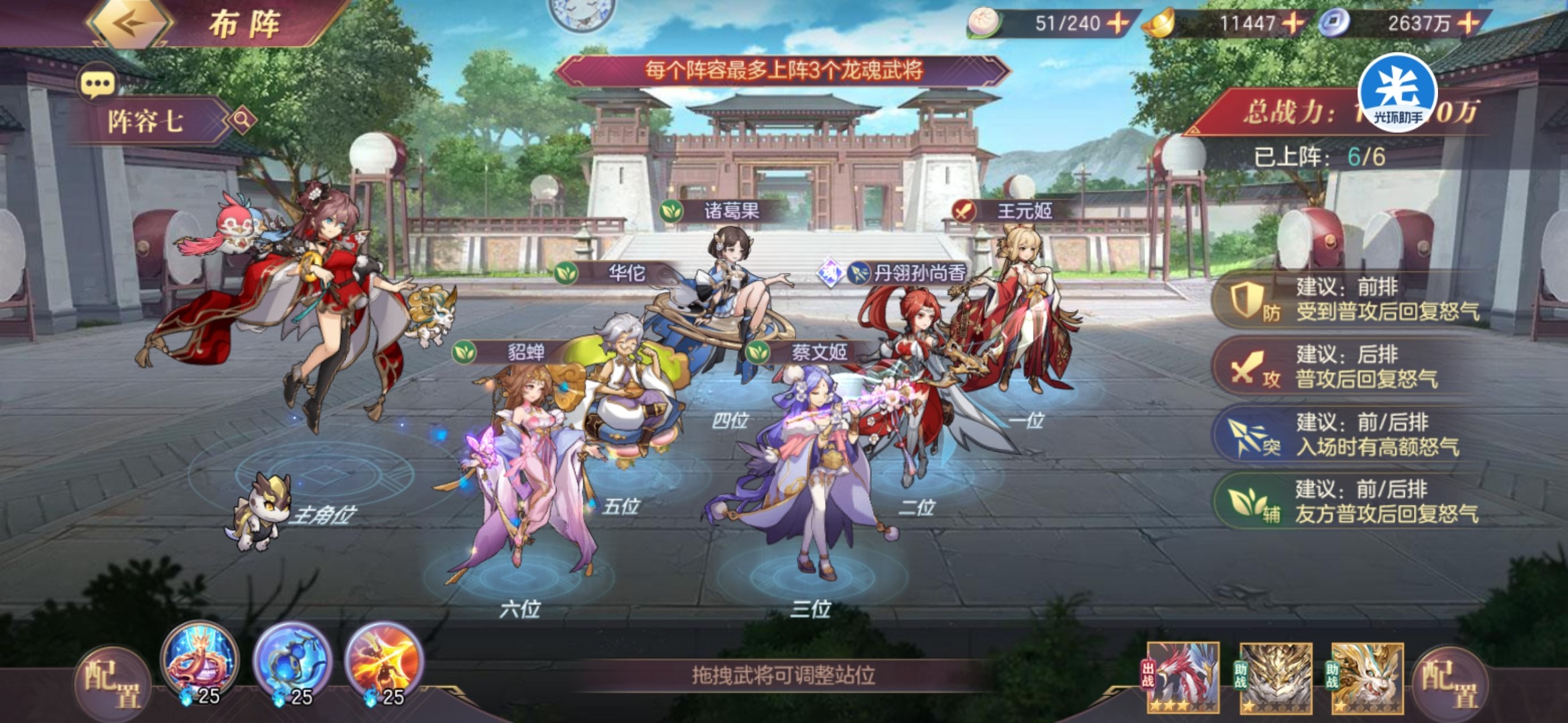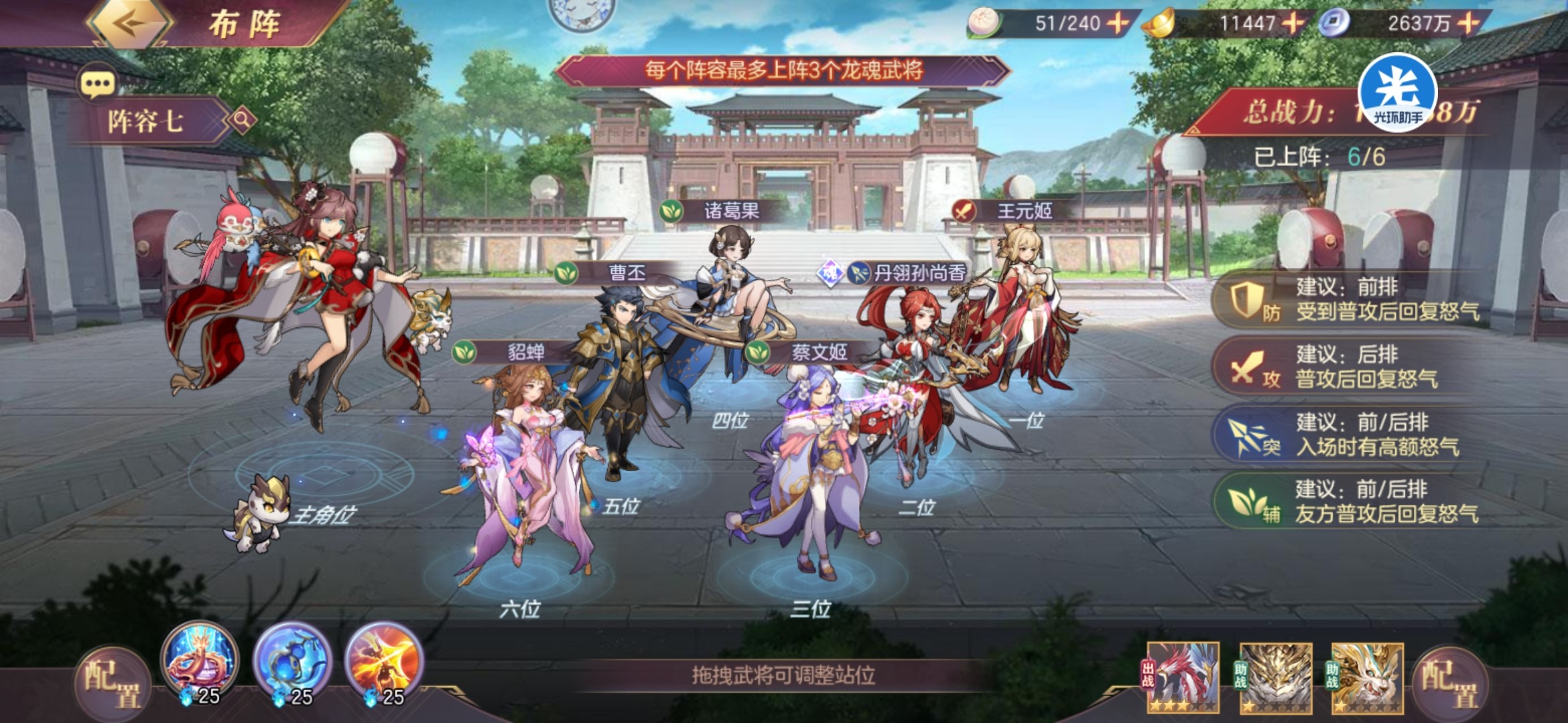 上阵专武蔡文姬,专武华佗,王元姬,提供大量回复,配合翼护和胜机能为己方提供大量怒气,从而达到怒气循环的效果。