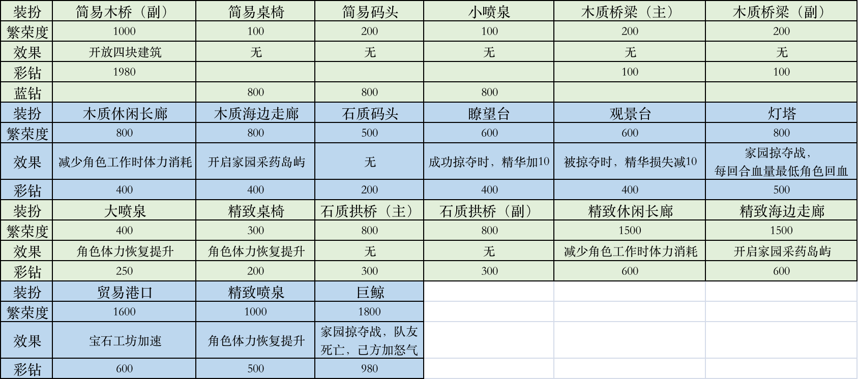 注意:建筑繁荣度按最高等级计算,各等级间不累加。同一装饰,木质、石质、精致繁荣度可以累加。