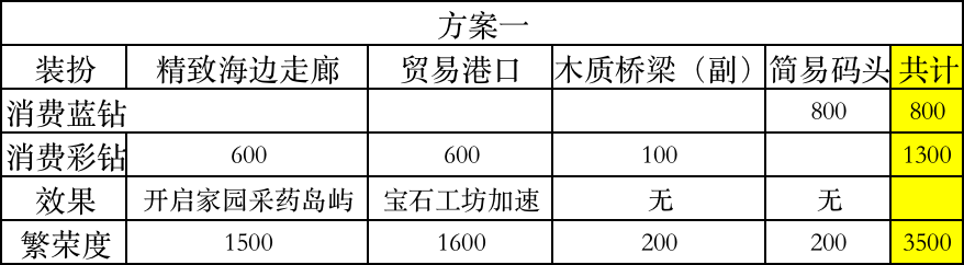 方案一:消费1300彩钻加800蓝钻获得3500繁荣度;