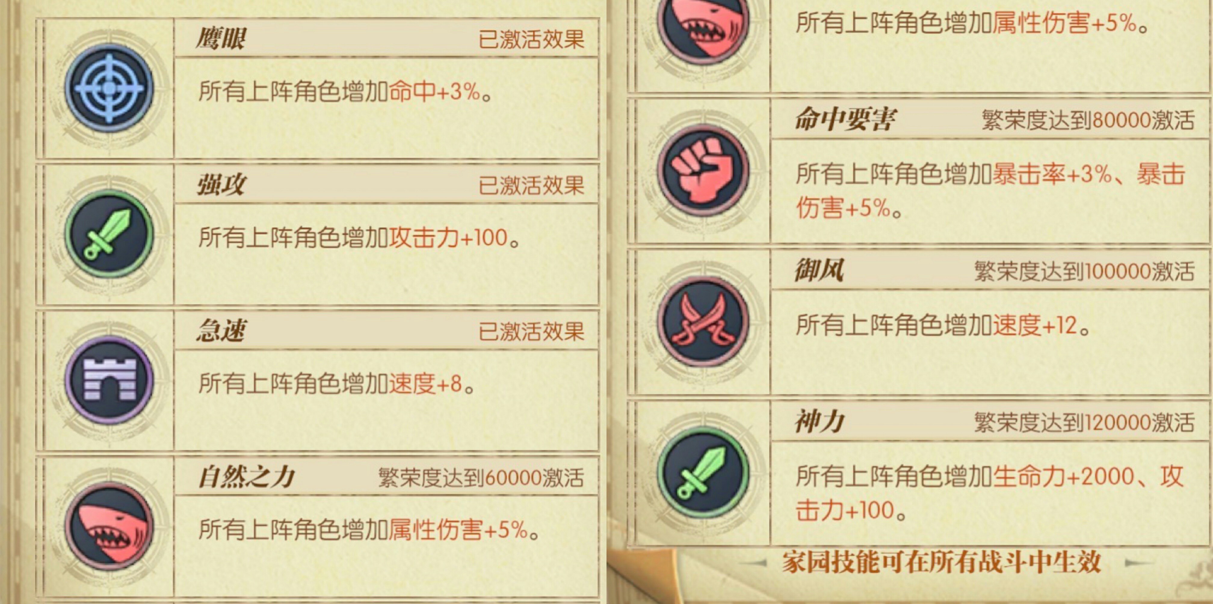 家园能获得游戏资源和角色属性加成。资源就不赘述了,杯水车薪,本文重点分享角色属性加成。角色属性加成主要靠繁荣度(游戏左上角那个叹号)。