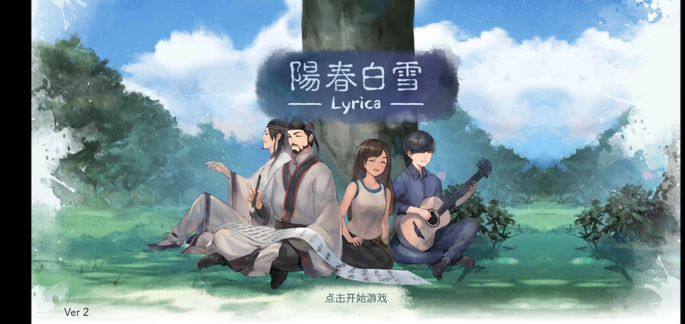 看画面很有意思,大树底下坐着四个人,两个身着古装,留着胡子,发型也是古时的装扮。而古风翩翩的两人旁边是现代服饰的青春少年,一个抱着吉他在弹奏,一个开心听唱。从开篇就暗示了你,这是一个古风意境的音乐游戏。
